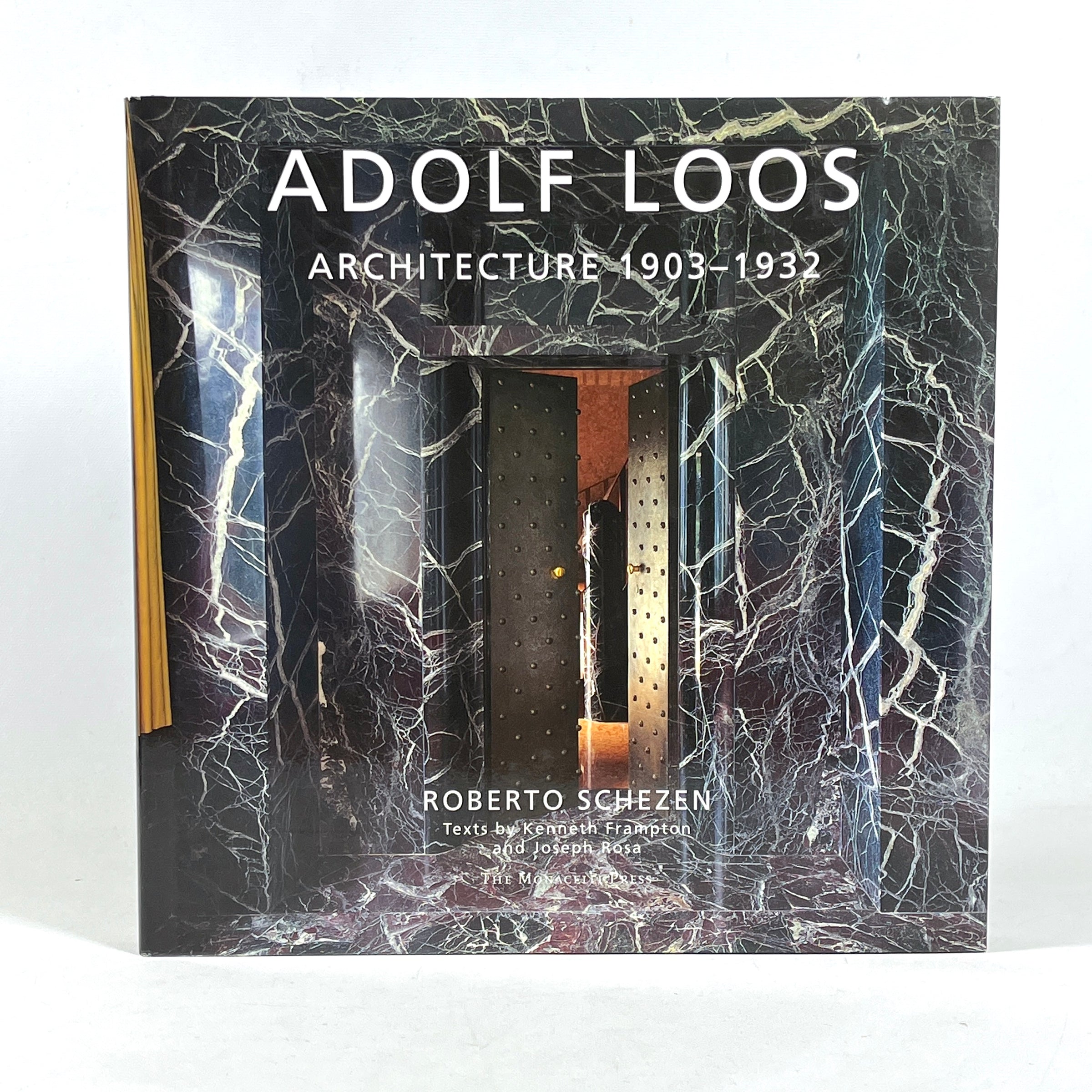 Hardcover in black paper. Slight bend to panels and text block, mild temperature waffling (not water damage), and light pigment transfer in-verso throughout. Near Fine black pictorial dust jacket, light wear to head and tips, now in Mylar. 180 pp. Includes black-and-white and full-color photographs of Loos' designs, with detailed shots of interiors and building façades, taken by Roberto Schezen. Explores the work of Adolf Loos, an Austrian and Czechoslovakian modern architect and theorist, through images of 20 of his most significant buildings, an informed essay by Kenneth Frampton, and descriptions of each project, by Joseph Rosa. Overall, a tightly bound and attractive copy.