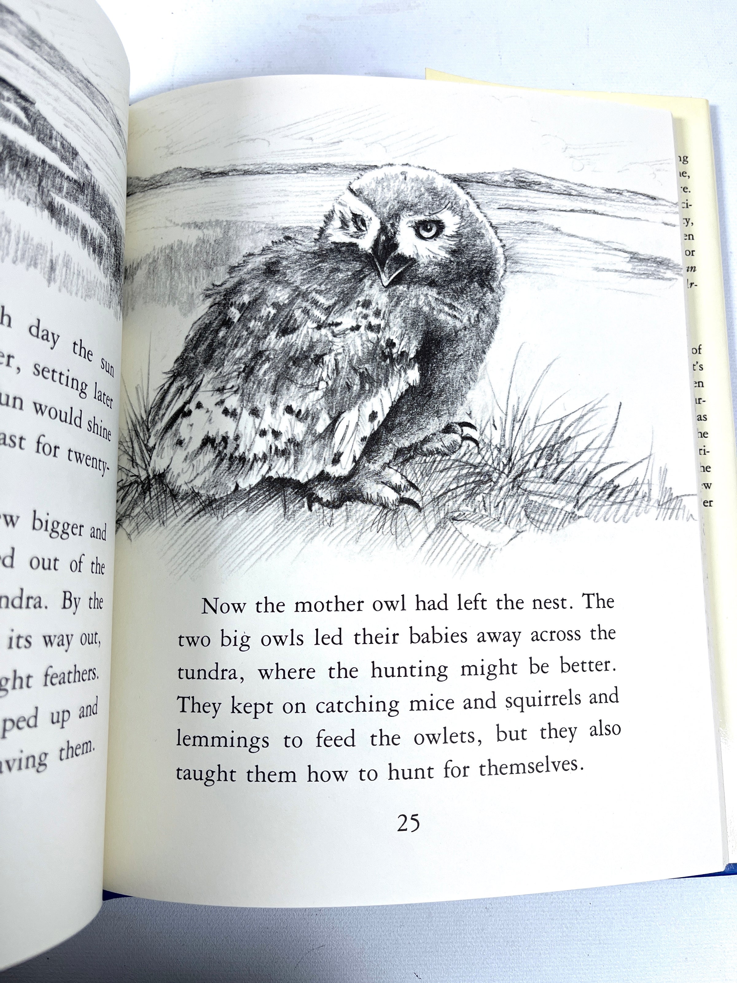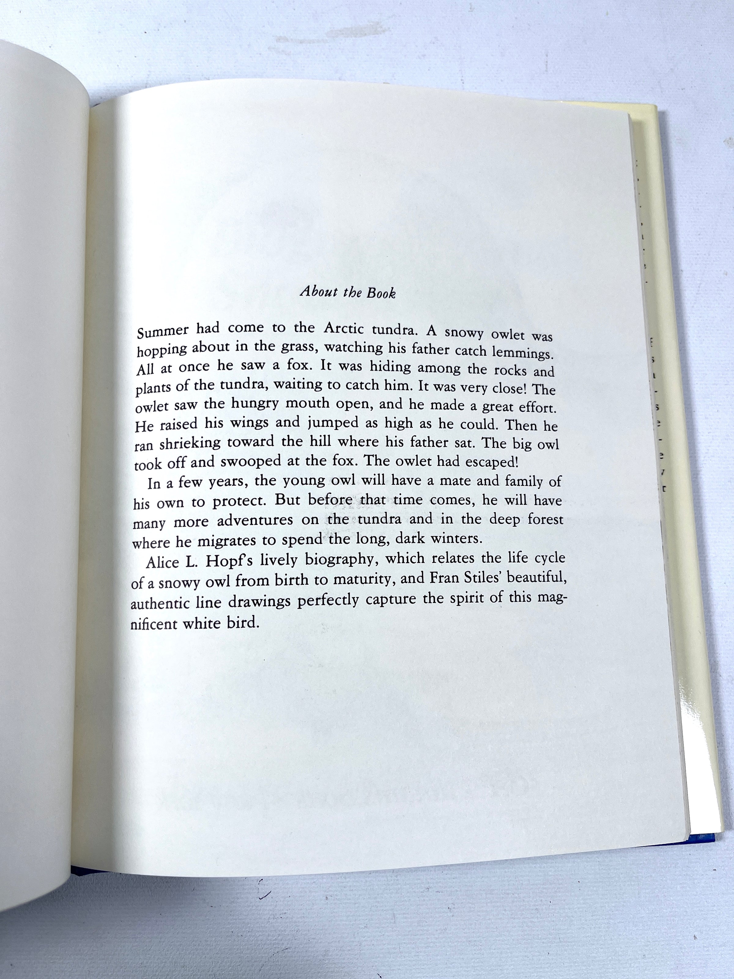 Hardcover in blue cloth with a stamped black owl illustration to the front panel. Light toning to pastedowns and endpapers. Very Good pictorial dust jacket, minor peeling to tail, some sunning and shelf wear, price-clipped, now in Mylar. 62 pp. Includes reproductions of black-and-white illustrations that depict the owl and its journey throughout the book. From inside the dust jacket: "Alice L. Hopf's lively biography, which relates the life cycle of a snowy owl from birth to maturity, and Fran Stiles' beautiful, authentic line drawings perfectly capture the spirit of this magnificent white bird." Desirable edition of a collectible book.