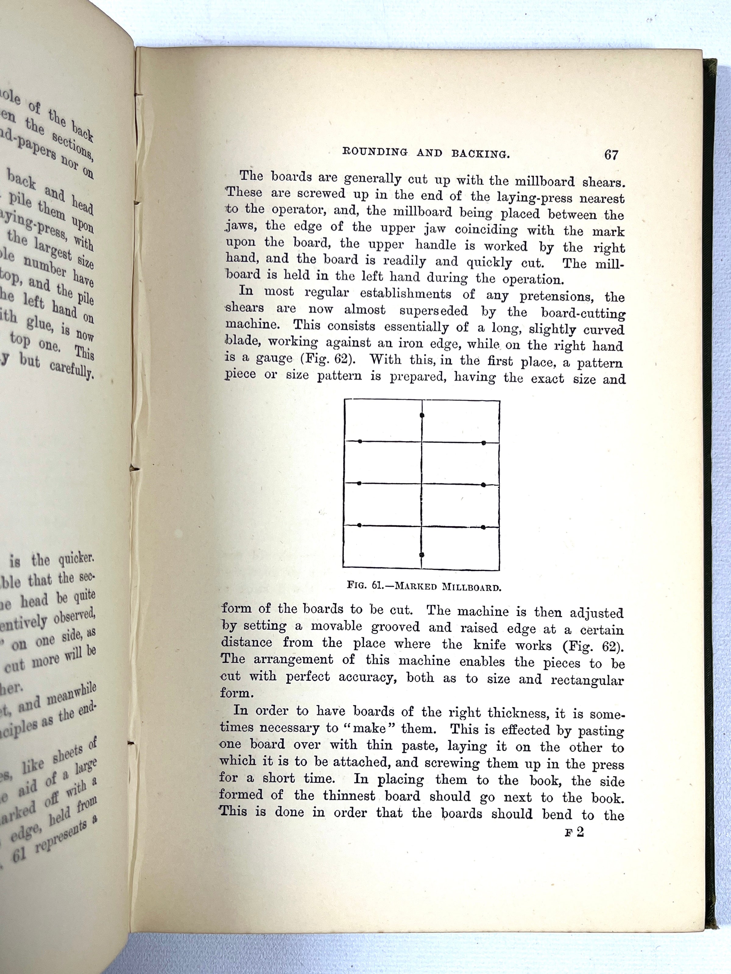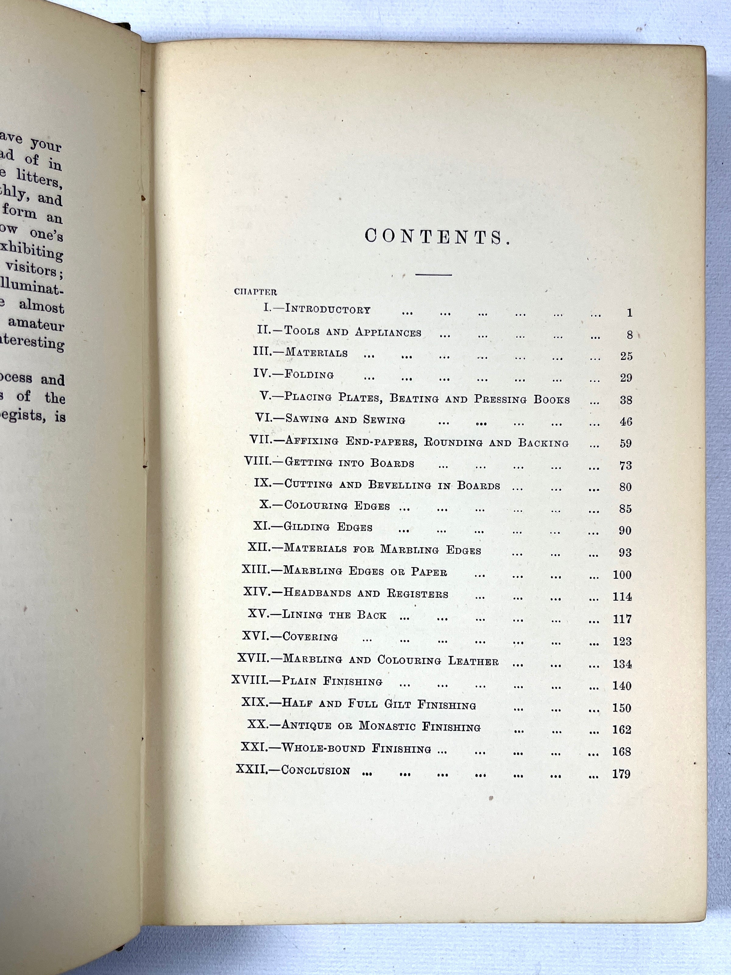 Green cloth, Gilt title lettering with black embossed decoration. 156 engraved illustrations. Previous owner name in pencil to title page. Rear hinge split but binding solid. Clean bright interior pages. Gill’s practical handbook series instructing amateurs in bookbinding, including descriptions of tools and their use, sewing, gilding, marbling, finishes, and techniques for coloring leather.