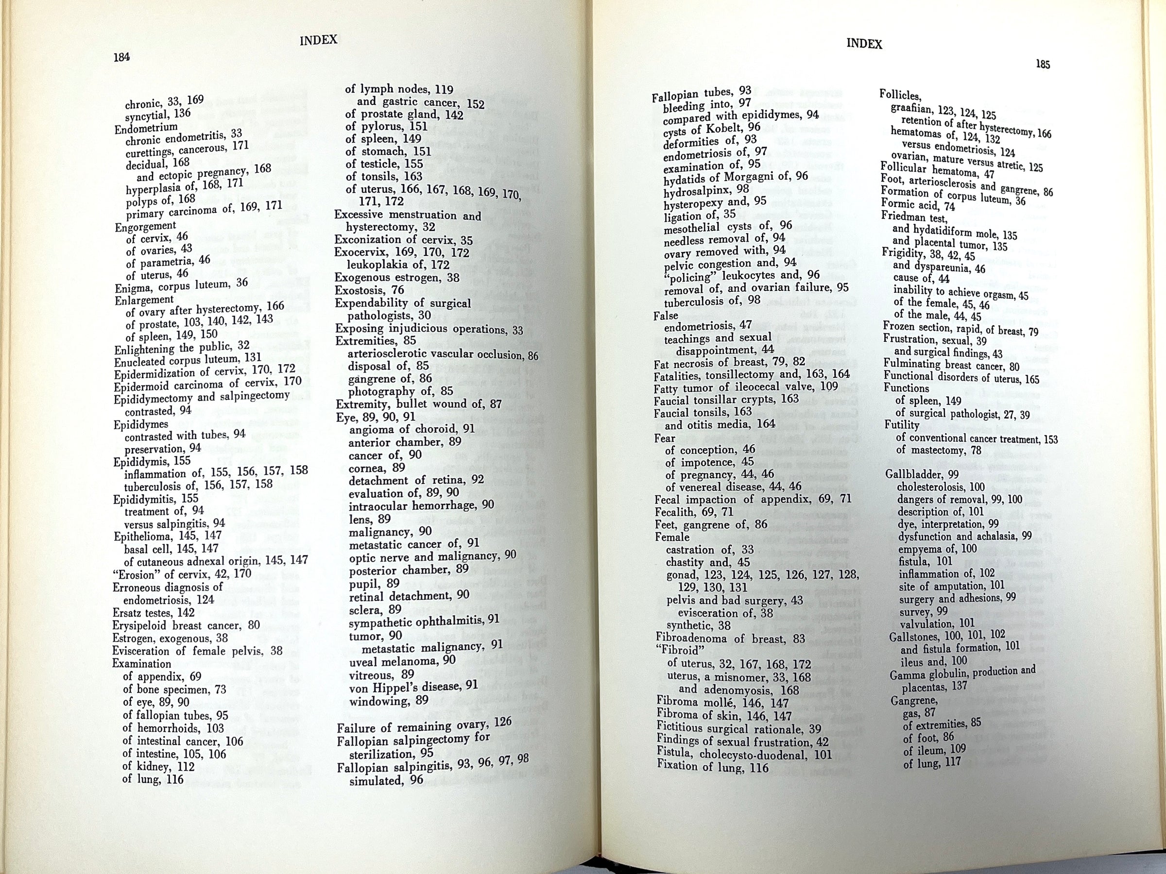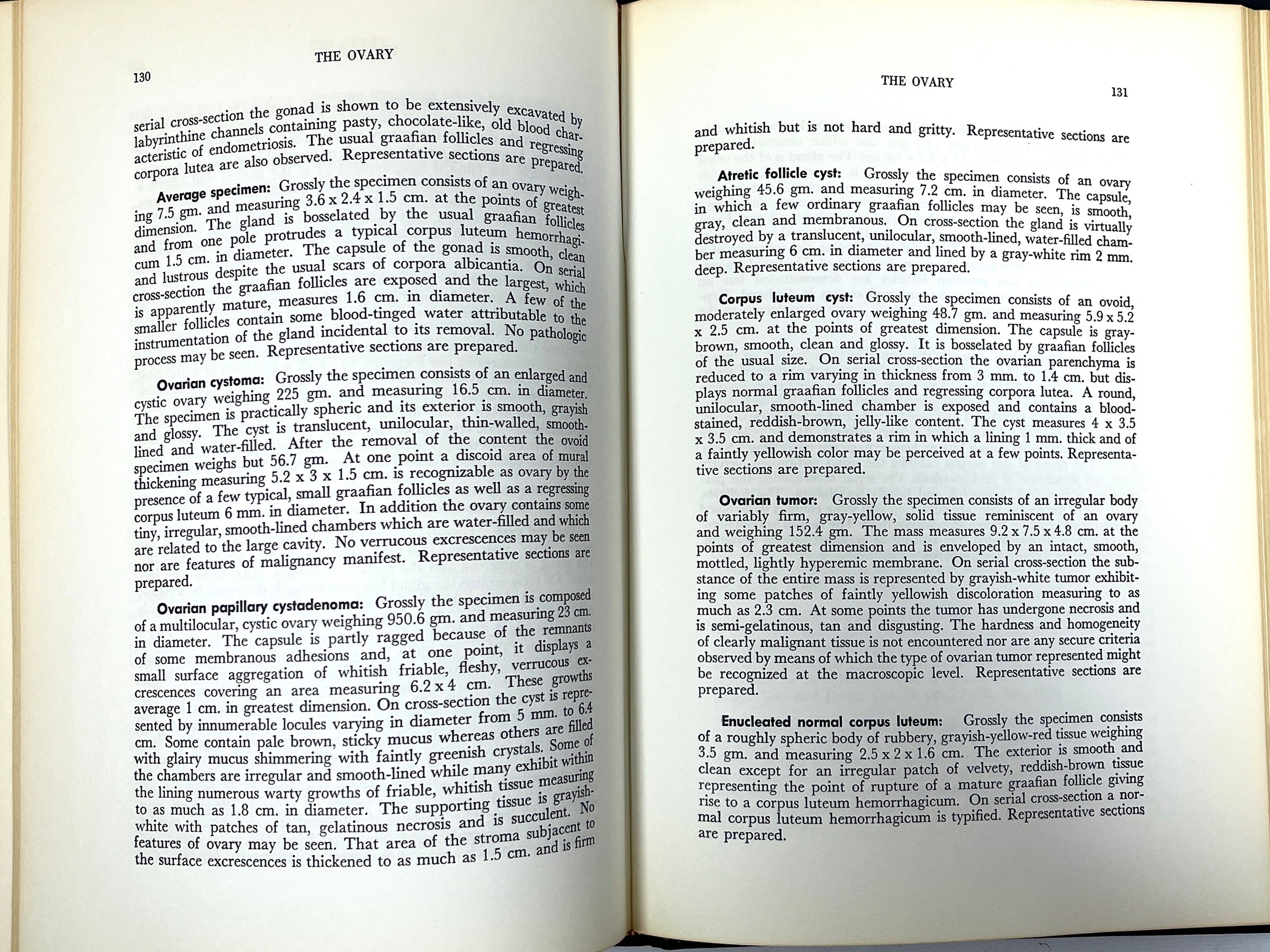Hardcover in navy blue leatherette binding, includes a signed, laid-in letter from the author, addressing a recipient doctor. Minor wear to head, tail, and tips, some sunning, a few marks to bottom text block edge, and small soiling to pg.49, otherwise attractive. 202 pp. Includes black-and-white reproductions of medical documentative photographs of different examples of ovaries. Interesting contribution to pathological medical history that focuses on the tumors and the sexual health of women while using dated medical terminology and thought processes, particularly when discussing the female reproductive system and its link to a woman's value in society. In the included letter, the author Robert P. Morhardt, D.O., acknowledges that his work can be seen as controversial, but goes on to recommend this book as a how-to surgical reference.