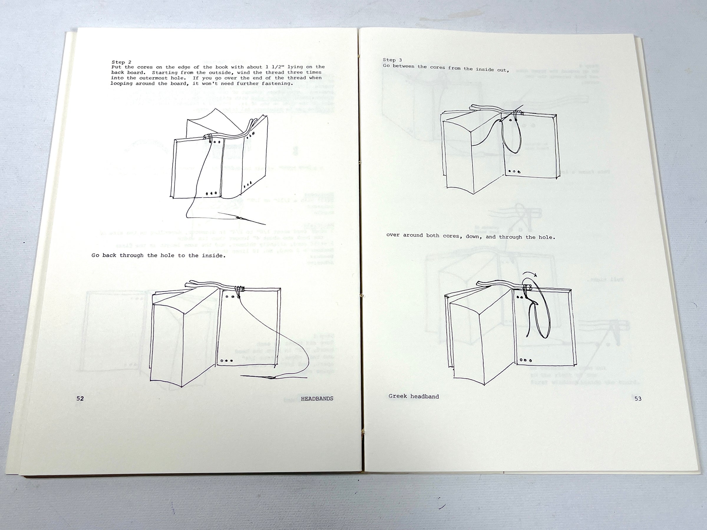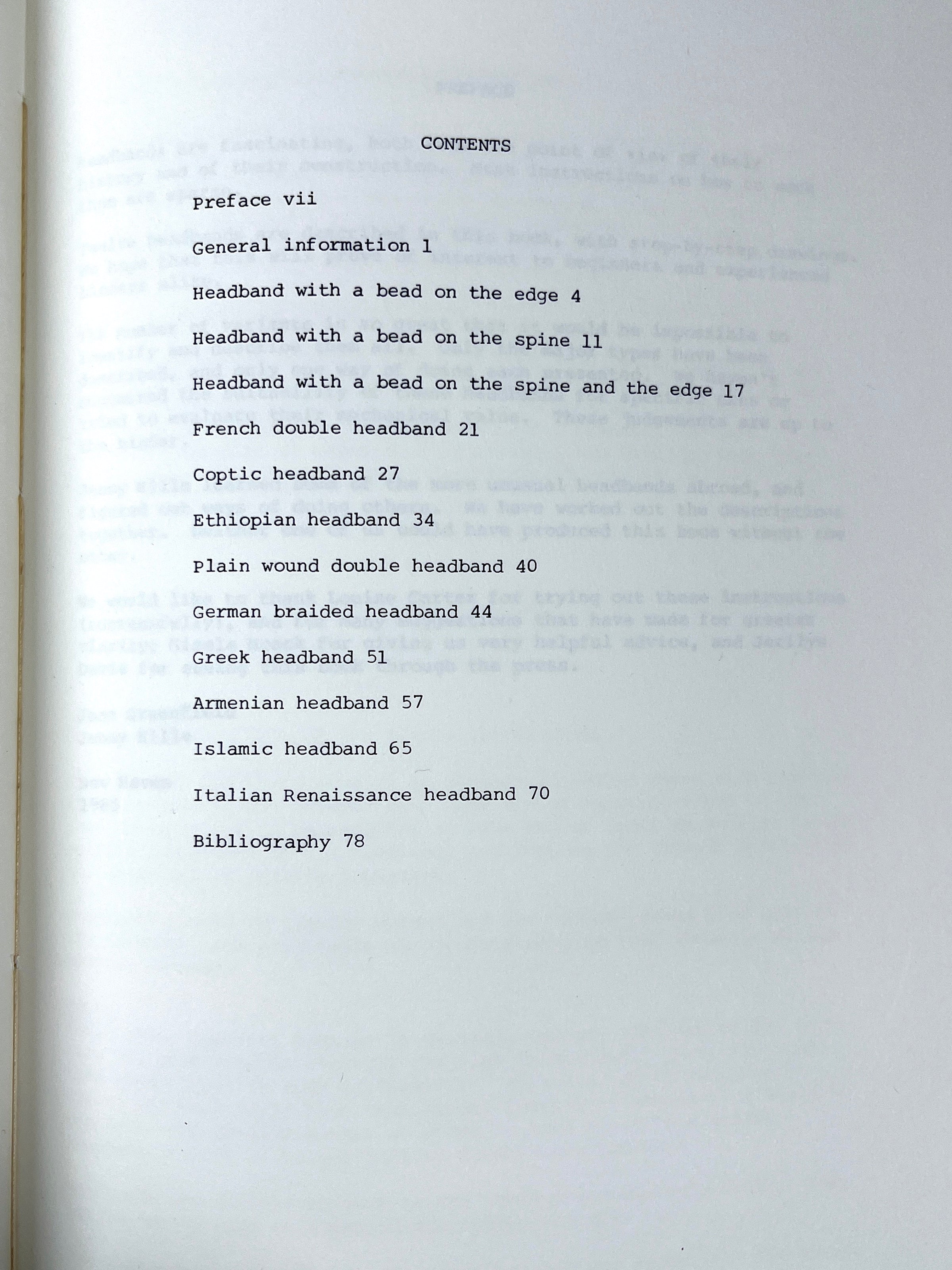 First Edition, softcover in white paper gatefold wraps with black pattern illustrations, unattached to sewn signatures. Light soiling to outer wraps and price sticker to interior flap. 80 pp. Includes black ink instruction illustrations. Provides a comprehensive guide to working with headbands in the bookbinding practice, general information, and examples, such as the French double headband, the Plain wound double headband, the Italian Renaissance headband, and much more.
