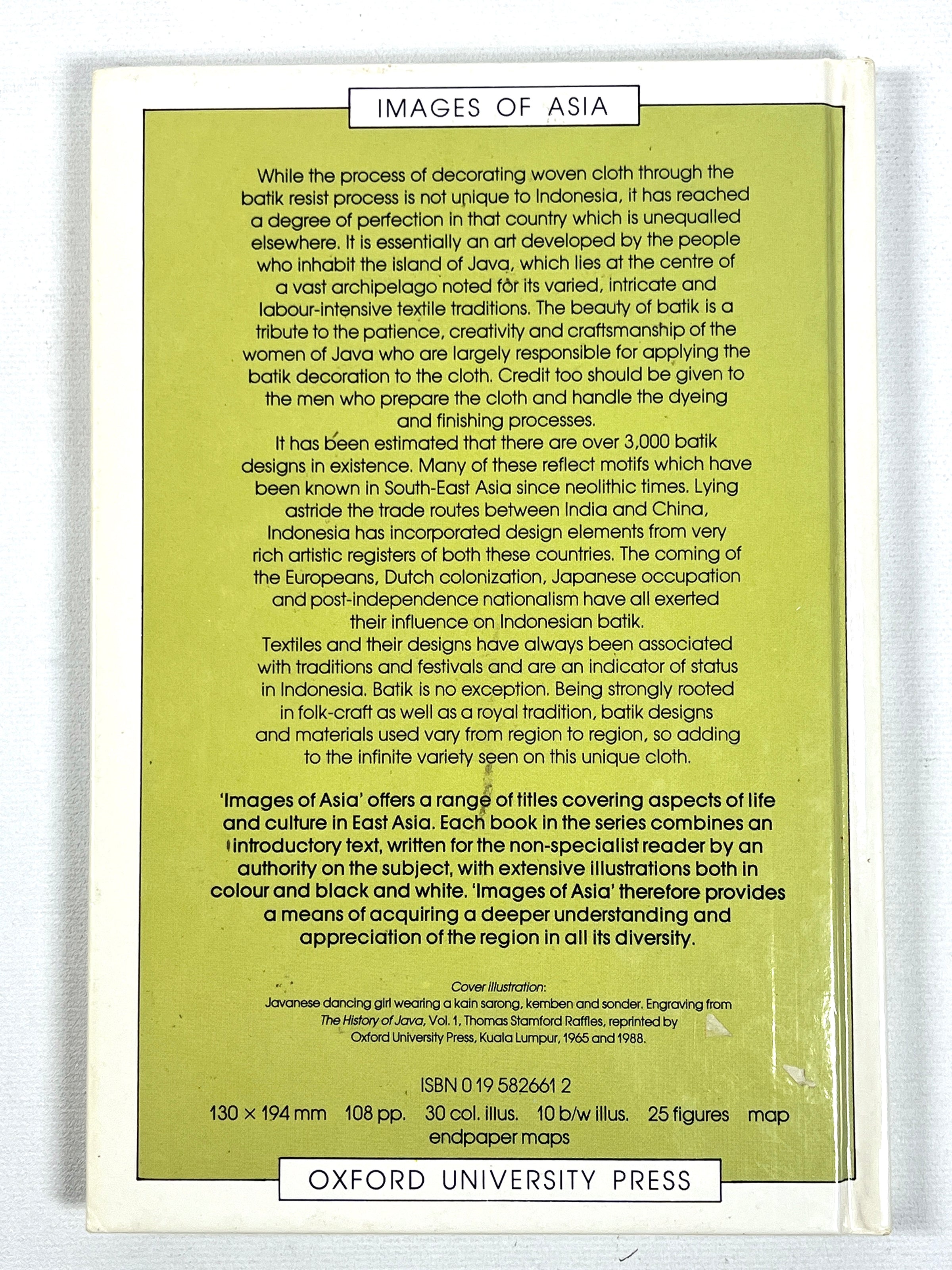 Hardcover in pictorial paper. Some foxing and minor sunning. 108 pp. Includes 30 full-color and 10 black-and-white images, 25 illustrative figures, and endpaper maps. From the back panel: "'Images of Asia' offers a range of titles covering aspects of life and culture in East Asia. Each book in the series combines an introductory text, written for the non-specialist reader by an authority on the subject, with extensive illustrations both in colour and black-and-white." This volume covers the tradition of Indonesian batik, with discussions on the artistic process, its presence on traditional clothing such as the sarong, the designs that vary from region to region and social status, and the centers of production.