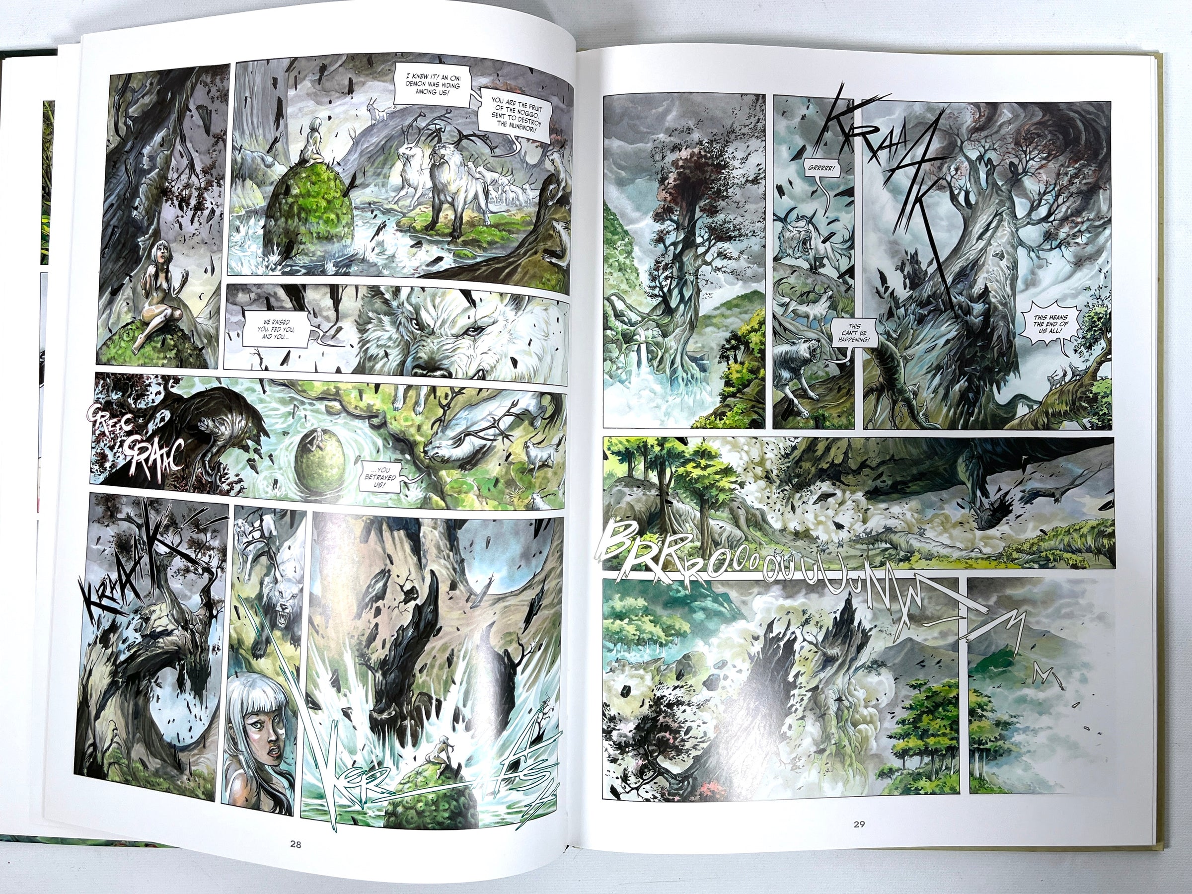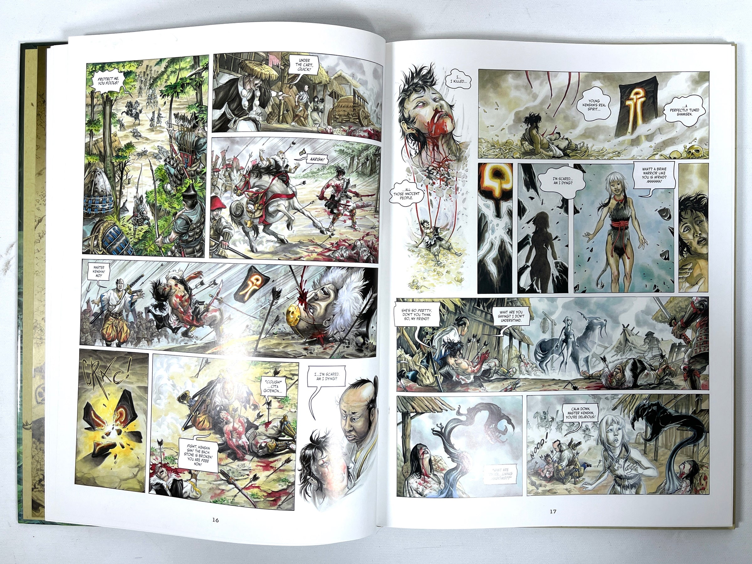 Fine folio, image of women and mythical creatures at a forested lake on the front cover, gray spine with white and yellow lettering, brown back cover with red and black lettering, 94 pp. Full-color illustrations in framed panels by Carita Lupattelli. Saverio Tenuta is the co-writer and storyboard artist. Bruno Letizia is the co-writer. A blending of Japanese mythology with fantasy art, this graphic novel by Saverio Tenuta and his collaborators creates a rich, visually immersive story filled with depth and imagination.