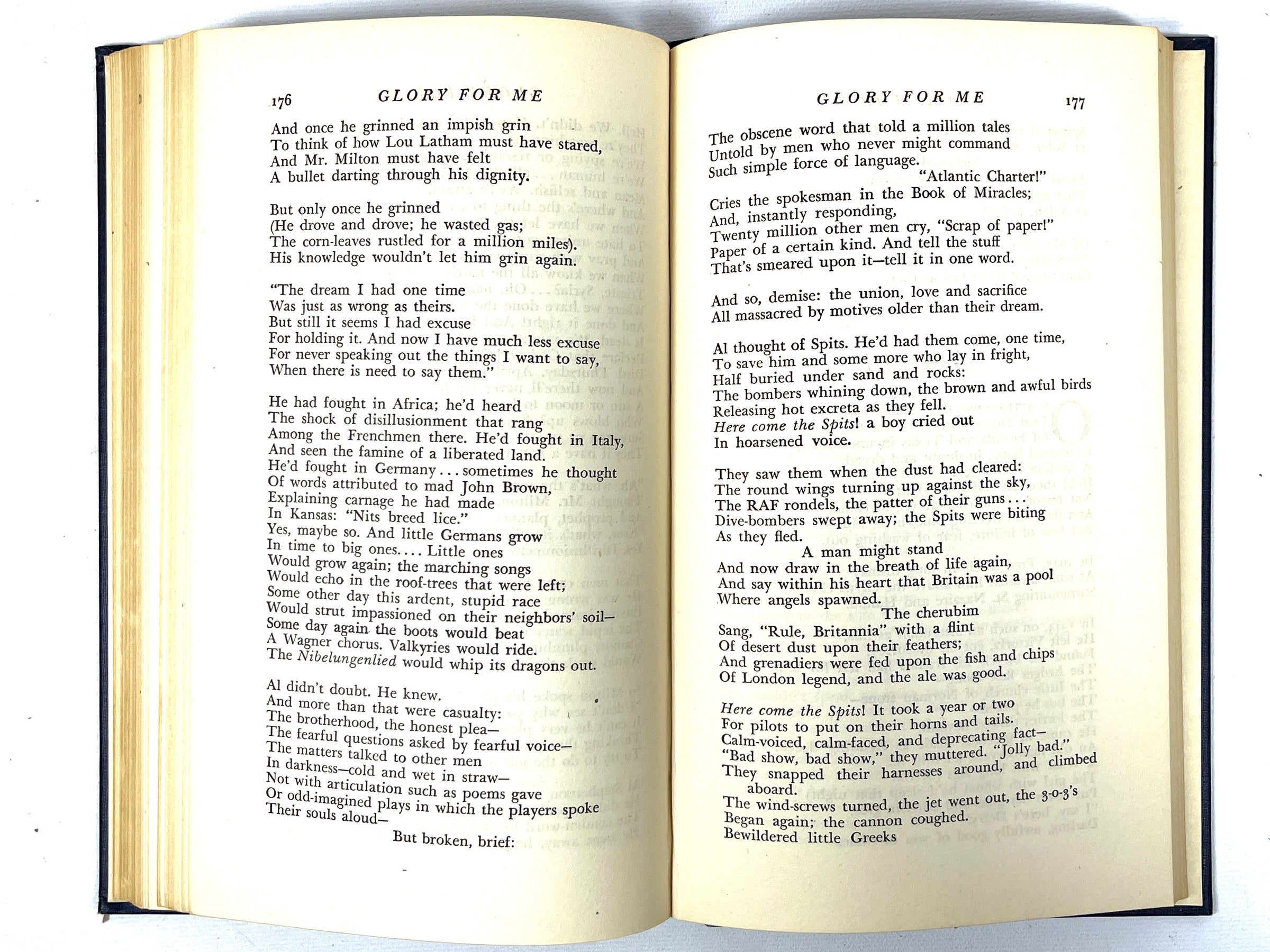 Hardcover in navy blue cloth with stamped gilt lettering to spine. Slight cocking to spine, a few small spots of paint to back panel, minor wear to exterior panels and tips, and light sunning. 268 pp. Beautiful edition of this narrative poem following the return of three World War II soldiers to civilian life, written by American writer, journalist, and Pulitzer Prize for Fiction winner, MacKinlay Kantor.