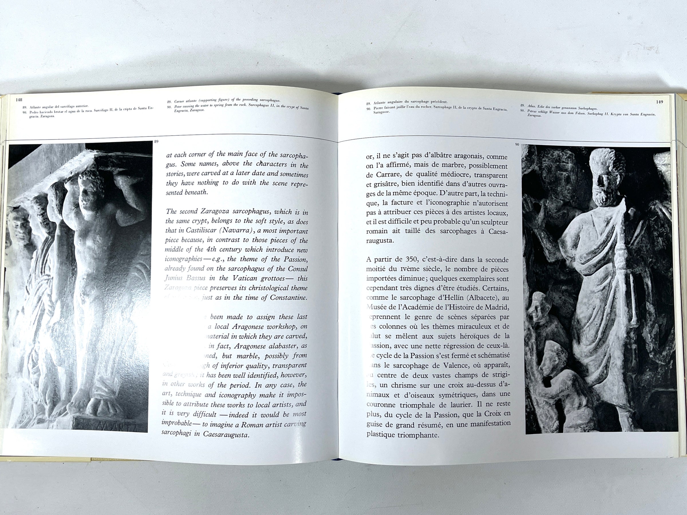 Very Good + quarto, cream cloth over boards with black lettering to spine, slight foxing to cover. Very Good, close-up photograph of Daniel, en el Frente de Sarcófago de wrapped around the dust jacket, white stripe to the top wrapped around, black lettering to front cover and spine, white lettering also to spine with white border, sunning to back cover, closed tear to back bottom edge, slight edgewear, slight foxing and sunning to inside of dust jacket, 377 pp. Multilingual text in Spanish, English, French, and German. Black-and-white and full-color images of sculptures, mosaics, architecture, ceilings, and architectural plans. Highlights the significance of early Christian art, showing its culture and history through detailed images.