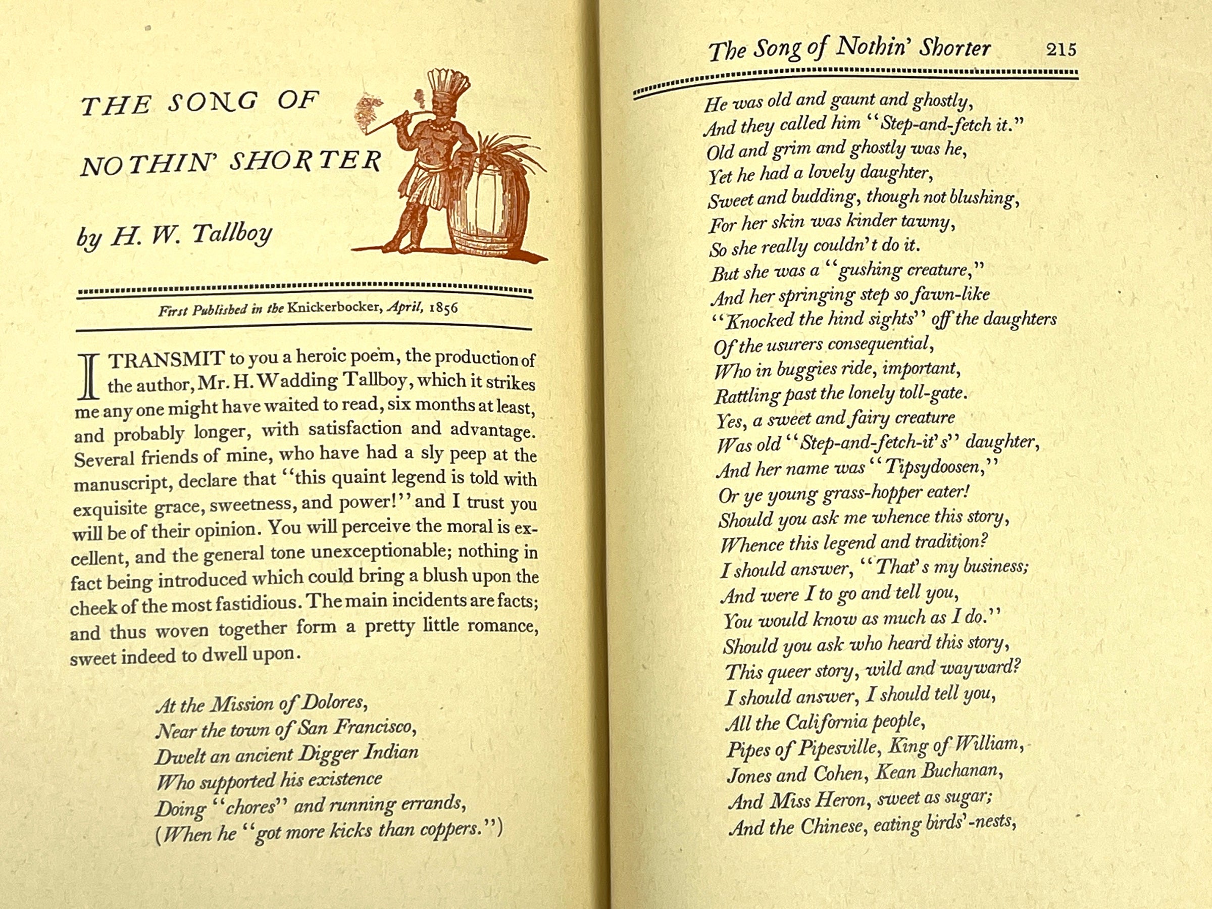 Hardcover in blue illustrated paper over tan buckram cloth backing, blue paper title label to spine with black lettering, and deckled edges. Slight cocking to spine, minor bumps to front panel's tips, some sunning, and light wear to title label edges. [v] xiii + 240 pp. Includes three blue pages with five ink illustrations, pages of Vol 3., No 34 of The Illustrated San Diego Herald, black and red illustrations to headers of each section, and two brown pages with two full-page ink illustrations. From the title page: "A Collection of the Burlesques & Sketches of John Phoenix; alias John P Squibob, who was, in fact, Lieutenant George H. Derby, U.S.A." This book is collection of writings by Derby, an early California humorist and U.S. army officer, filled with satirical tales and parodies of American life, with mention of many California cities and sights. Third series of Rare Americana. Number 5. One copy of 550 printed.