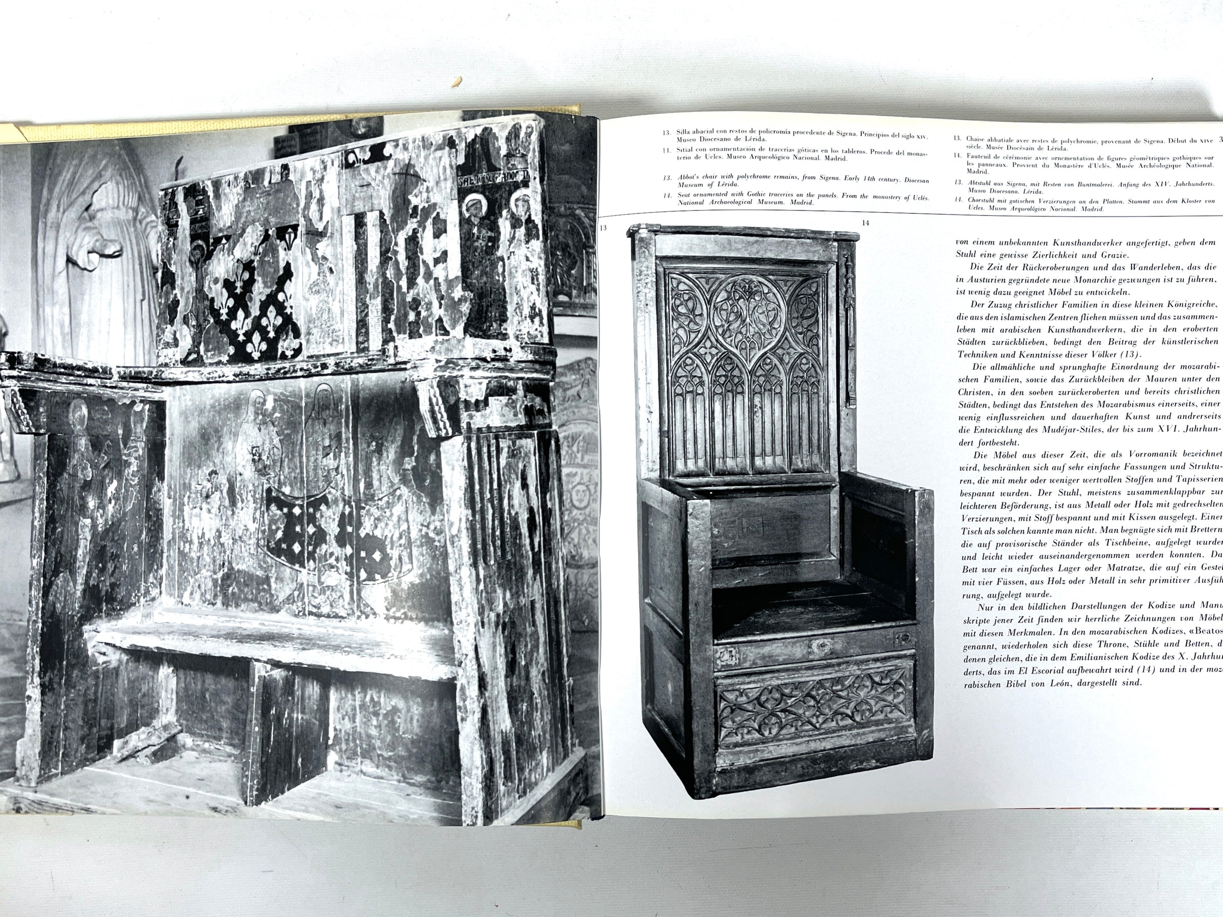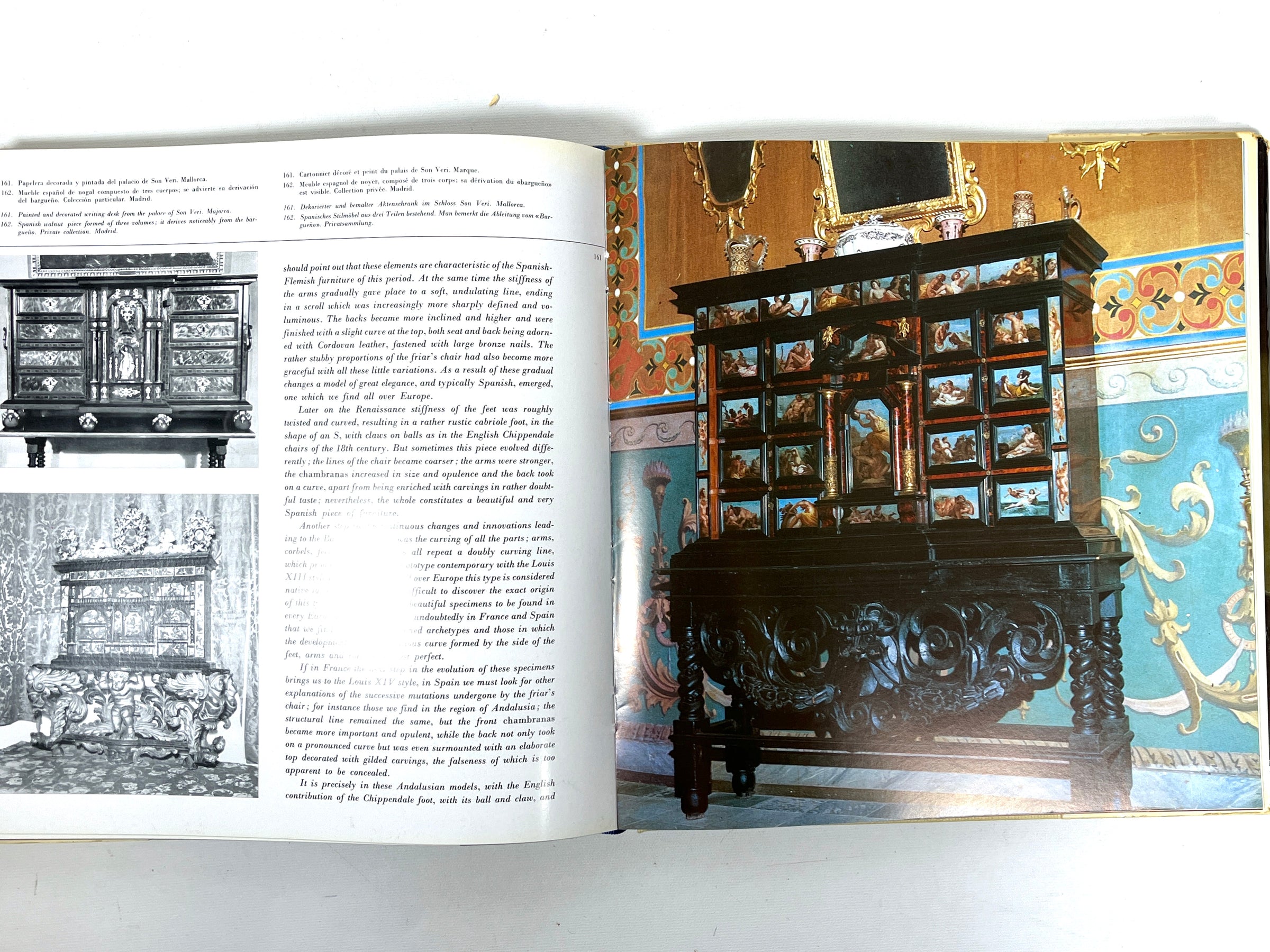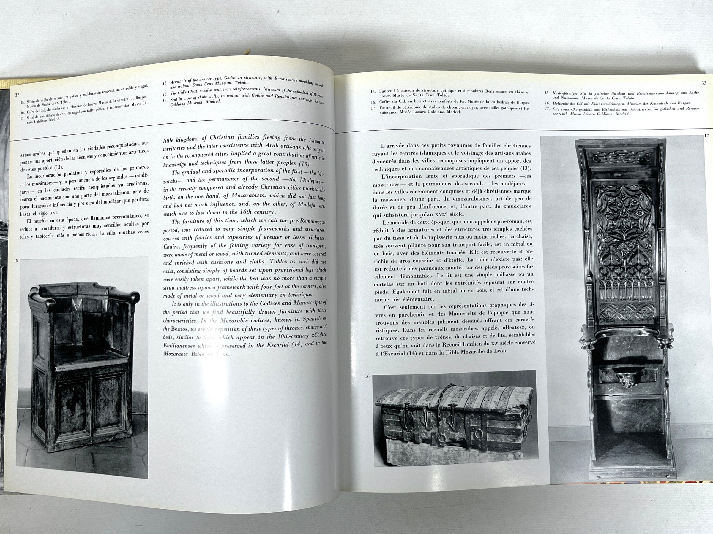 Very Good quarto, cream cloth over boards with black lettering to spine, very light staining to front cover and along top edges, light foxing to the first few pages at the front and back, sunning along page edges. Very Good dust jacket, cream front cover with red border, yellow lettering, and photograph of furniture piece, cream spine with black lettering and pink border, close-up photograph to the back cover of a piece of wood furniture, edgewear, closed tear to front bottom edge, open tear to the back top edge, slight foxing and sunning to inside of dust jacket, now protected in Mylar, 313 pp. Full-color and black-and-white photographs of Spanish furniture. Multilingual text in Spanish, English, French, and German. A comprehensive collection of Spanish furniture, spanning from Iberian and Roman eras to the 20th century, including movements such as Art Nouveau, and individual masters such as Gaudí.