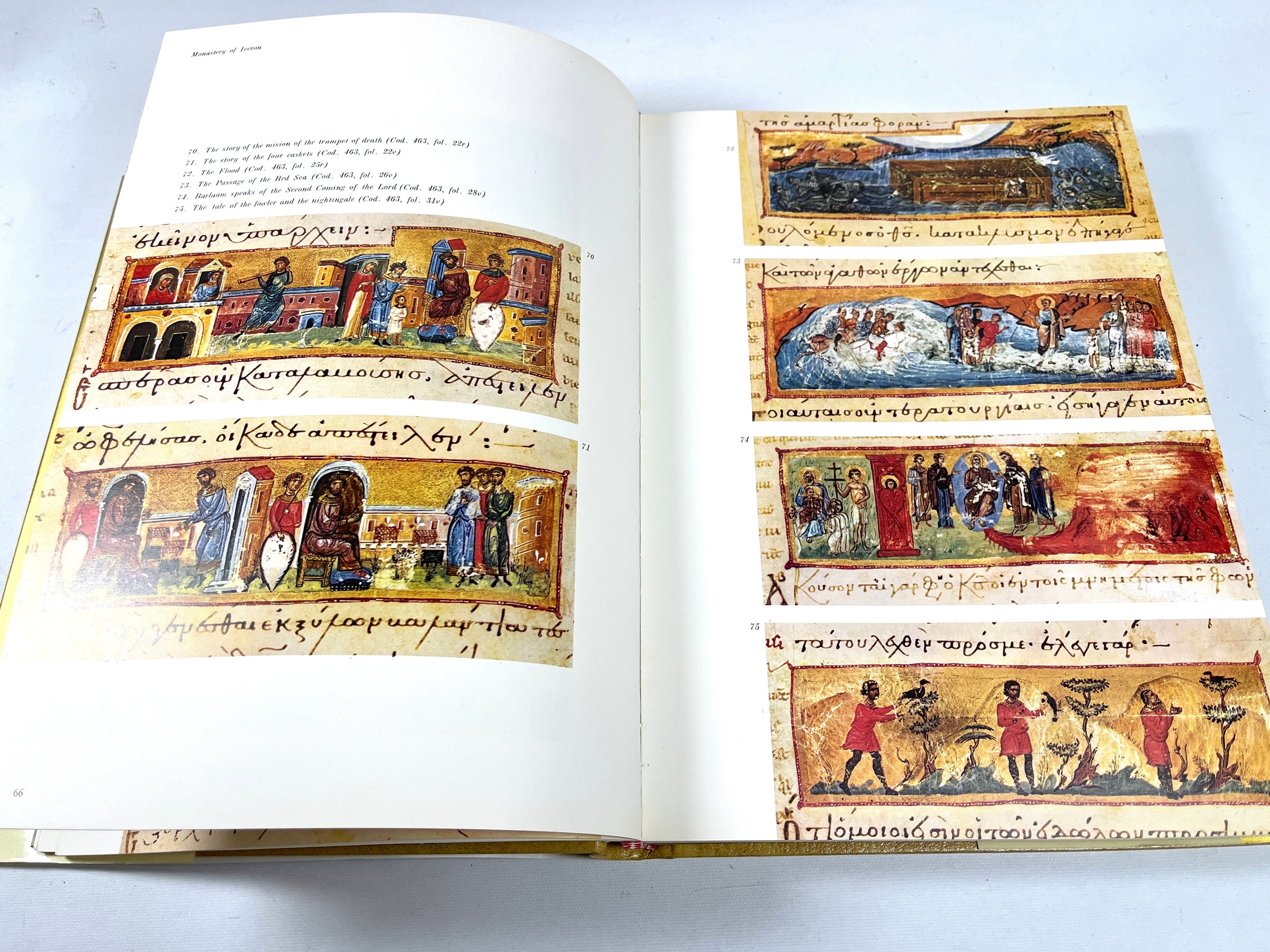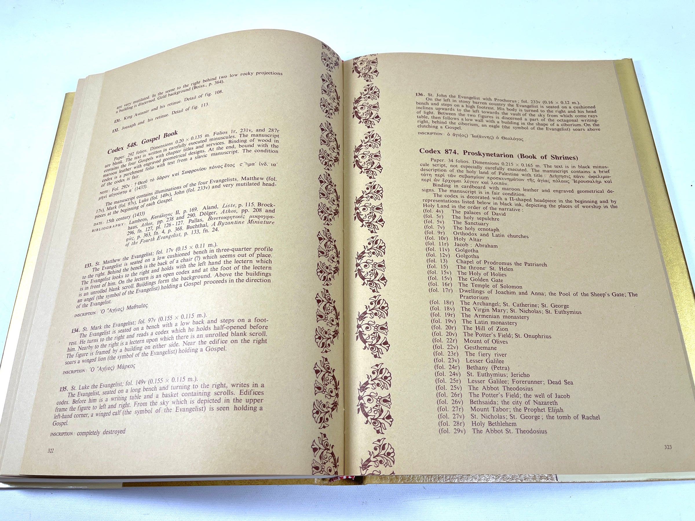 443 Full color illustrations throughout. Gold colored boards with decorative gilt stamped design to front panel. Decorative endpapers. Full color dust jacket with minor wear and small tear to front lower edge. Full color slipcase with wear to edges. Volume 2 of a 3 volume series documenting illuminated Byzantine and post-Byzantine manuscripts as found in the libraries of ancient monasteries of the ‘Holy Mountain’ Mount Athos, Greece, this volume being drawn from Iveron, St. Panteleimon, Esphigmenou, and Chilandari. Numerous large clear plates depict religious scenes and heavily embellished holy texts with extensive section of descriptive reference notes on thick brown paper stock included at rear.