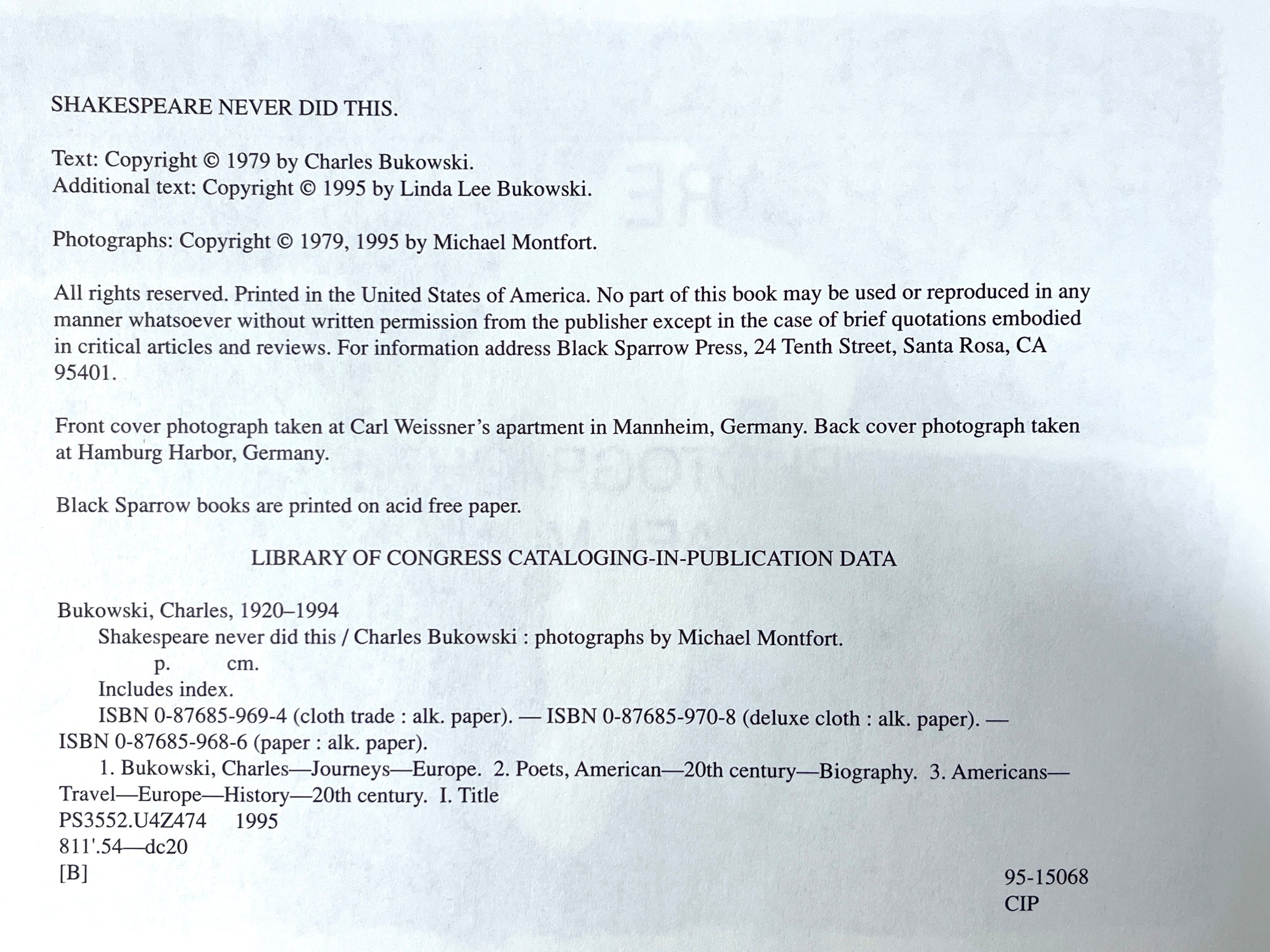 Bukowski, Charles, Shakespeare Never Did This, Santa Rosa: Black Sparrow Press 1995. Photographs by Michael Montfort. English, Fine, Hardcover, Oblong 8vo, 8 ½” x 10 ½”, Unpaginated.