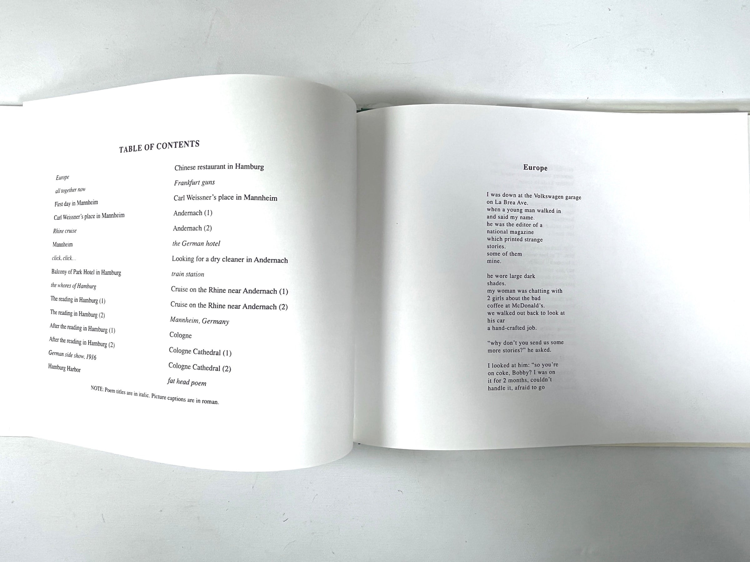 Printed title pasted to cloth spine. Color textured printed paper over boards, in Very Good acetate jacket as issued. One of 1000 hardback copies. ‘Augmented’ edition published after Bukowski’s death updating the original 1979 City Lights publication with 11 new poems. Filled with candid Black-and-White photographs by Michael Montfort documenting a drunken wine-soaked 1978 trip to Germany and France to visit Bukowski’s birthplace and meet relatives as well as to give readings and make appearances on French television.