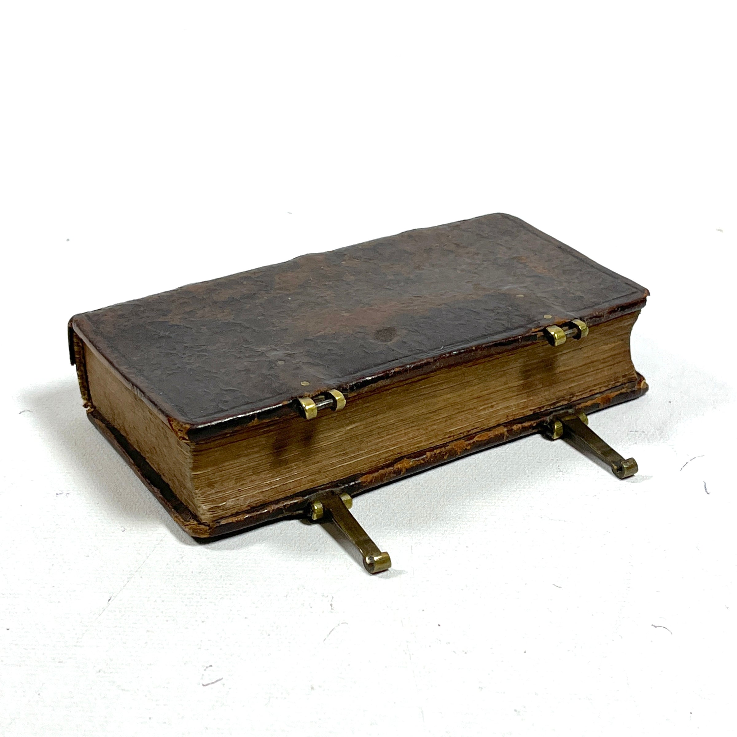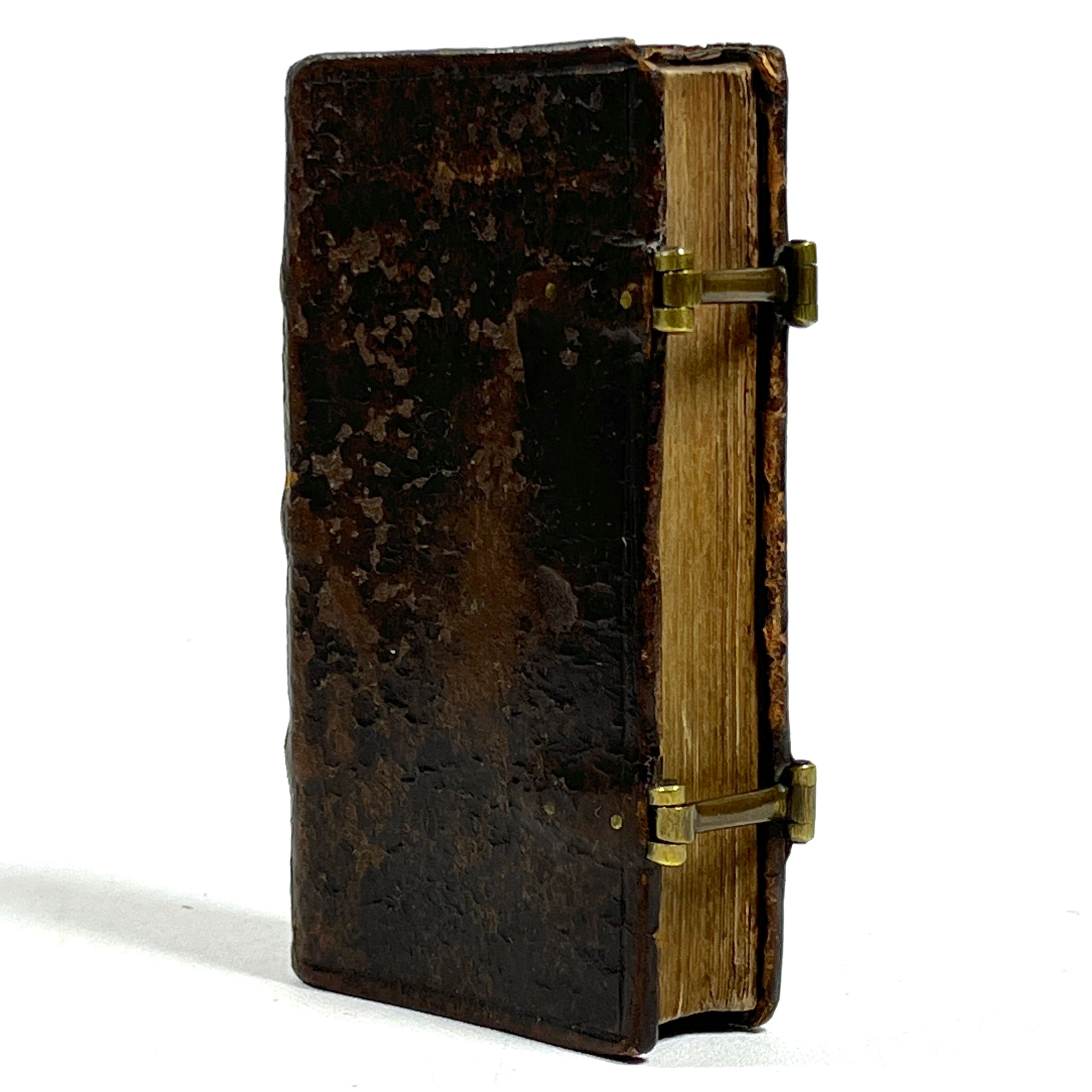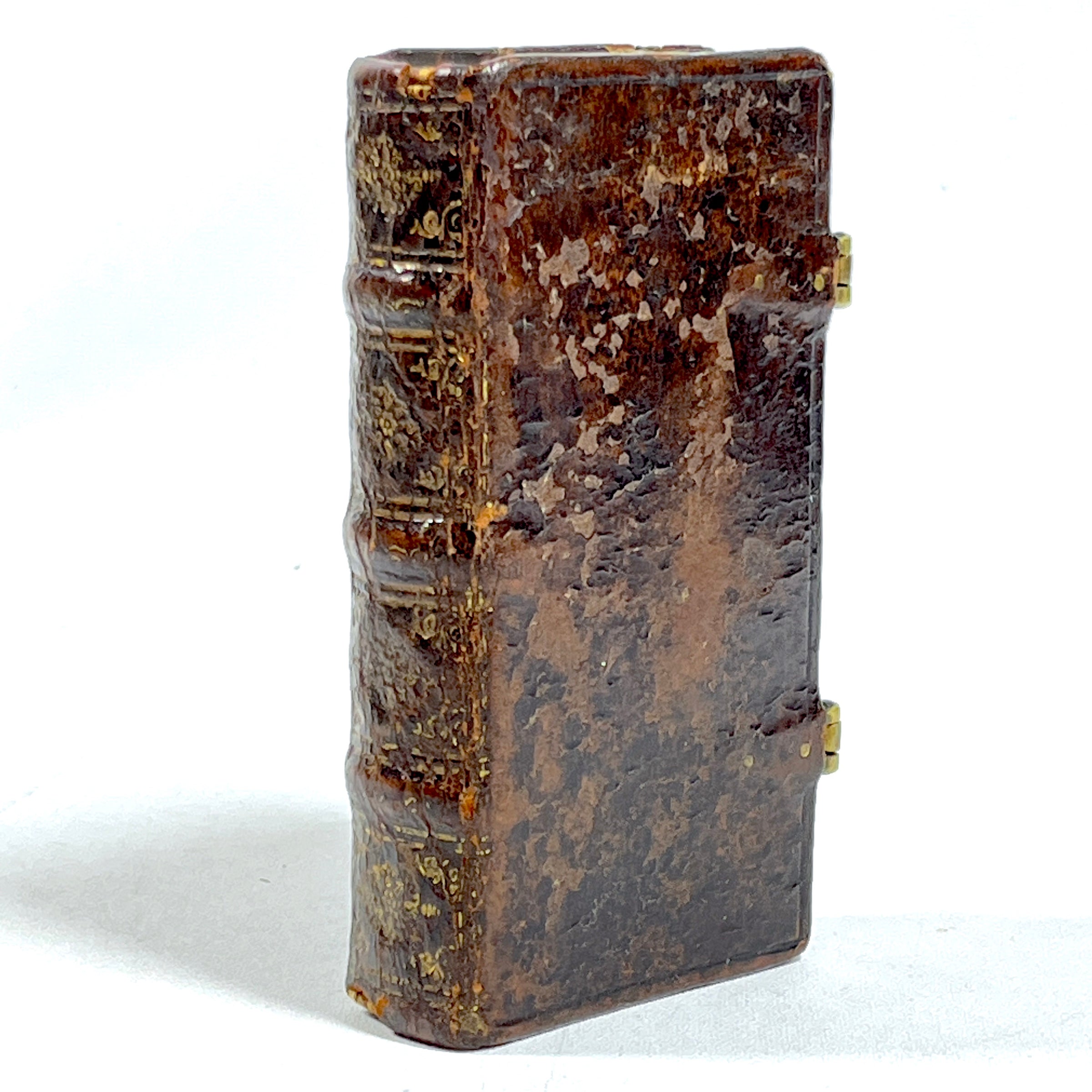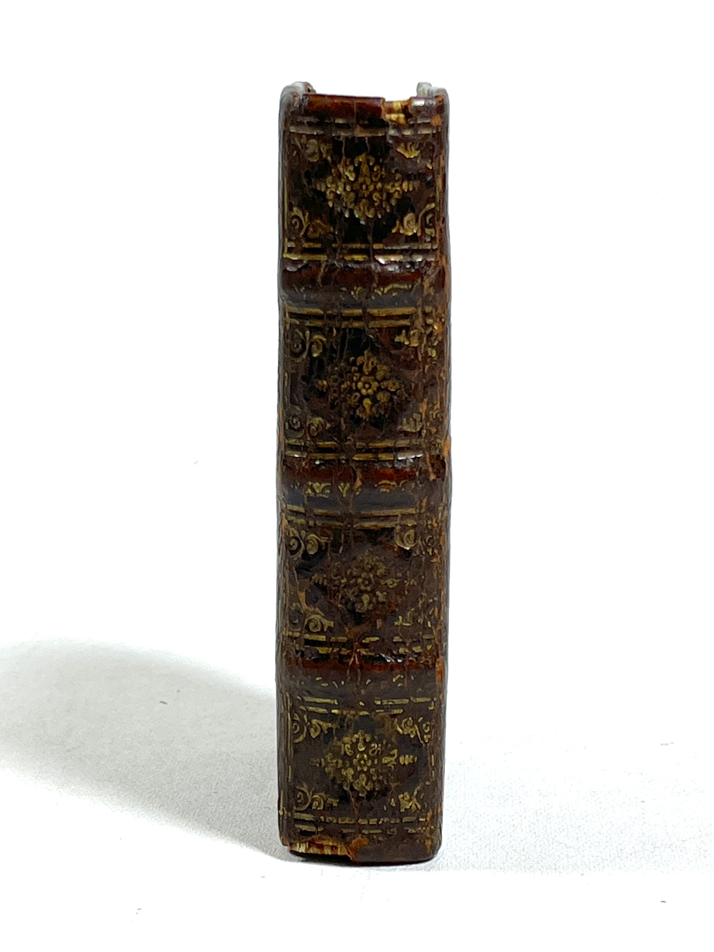 Dark brown calf leather binding, raised bands & small faint gilt decorations to spine, cover embedded closing metal clasps, very minor wear to edges, binding tight w/ minor separation at front gutter, interior pages clean & bright, approval by Pope Paul V dated 1618 precedes text, table of contents at rear, text in French.