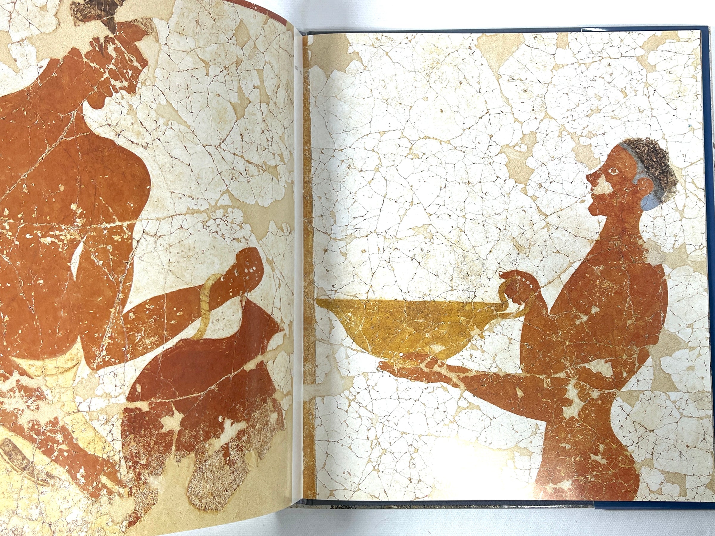 Hardcover in blue cloth. Slight cocking to spine, mild temperature waffling (not water damage), and pen inscription to front endpaper. Near Fine pictorial dust jacket, light wear to top tips, now in Mylar. 191 pp. Replete with full-color images of the wall-paintings, the excavation sites, and two fold-out images. Explores the wall-paintings, or frescoes, found at the ruins of the Cycladic Bronze Age city, Akrotiri, on the Greek island, Santorini, also known as Thera, from details of decorated birds and animals, to larger-scale scenes of the city and the sea. Overall, tightly bound and attractive.