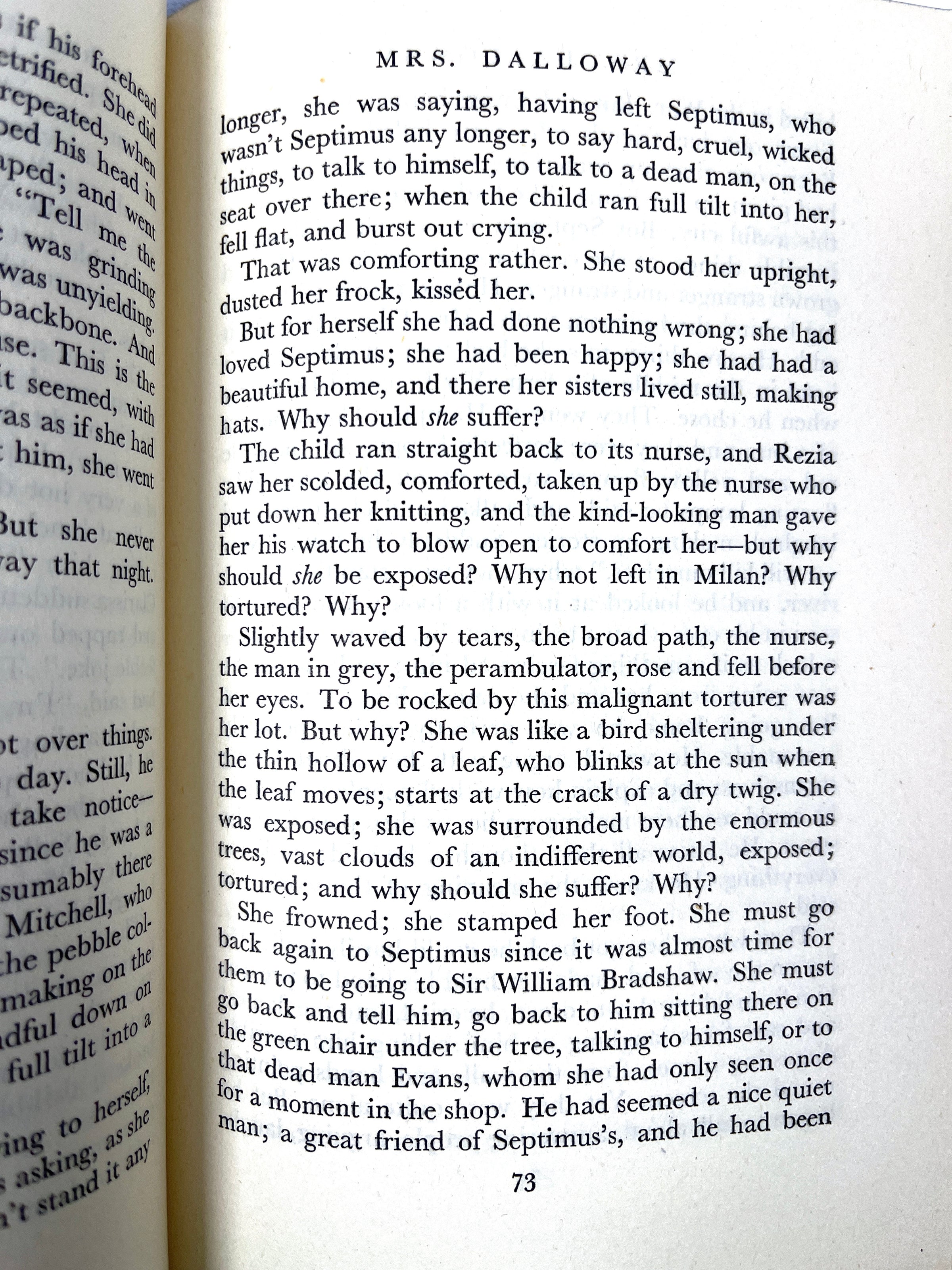 Hardcover in blue floral-patterned cloth, green title label to spine with stamped gilt lettering. Light wear and some sunning. 213 pp. Early Reprint of British modernist author and feminist, Virginia Woolf's most well-known novel, which details an English upper-class lady's life through memories, the lingering effects of World War I, and social intricate structures.