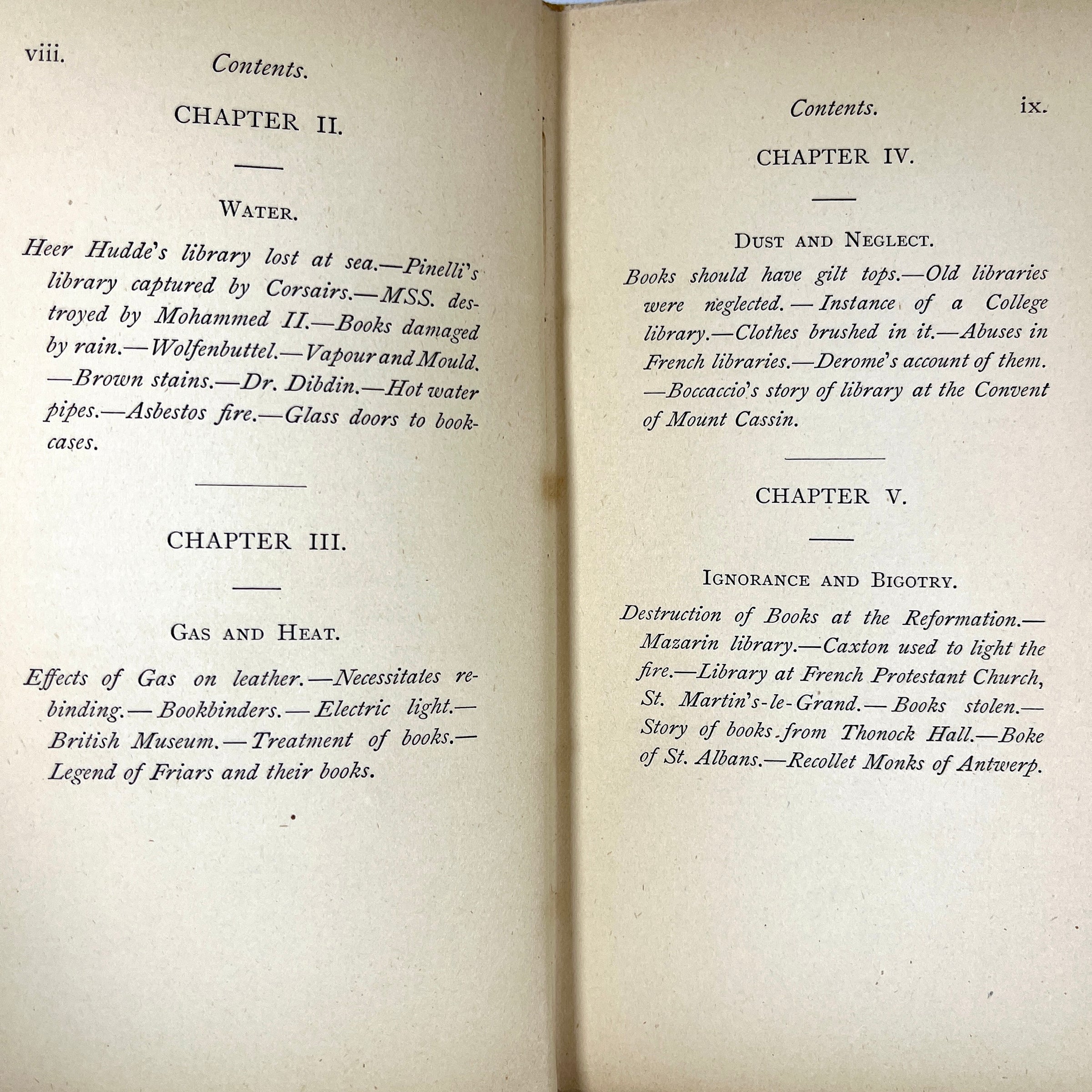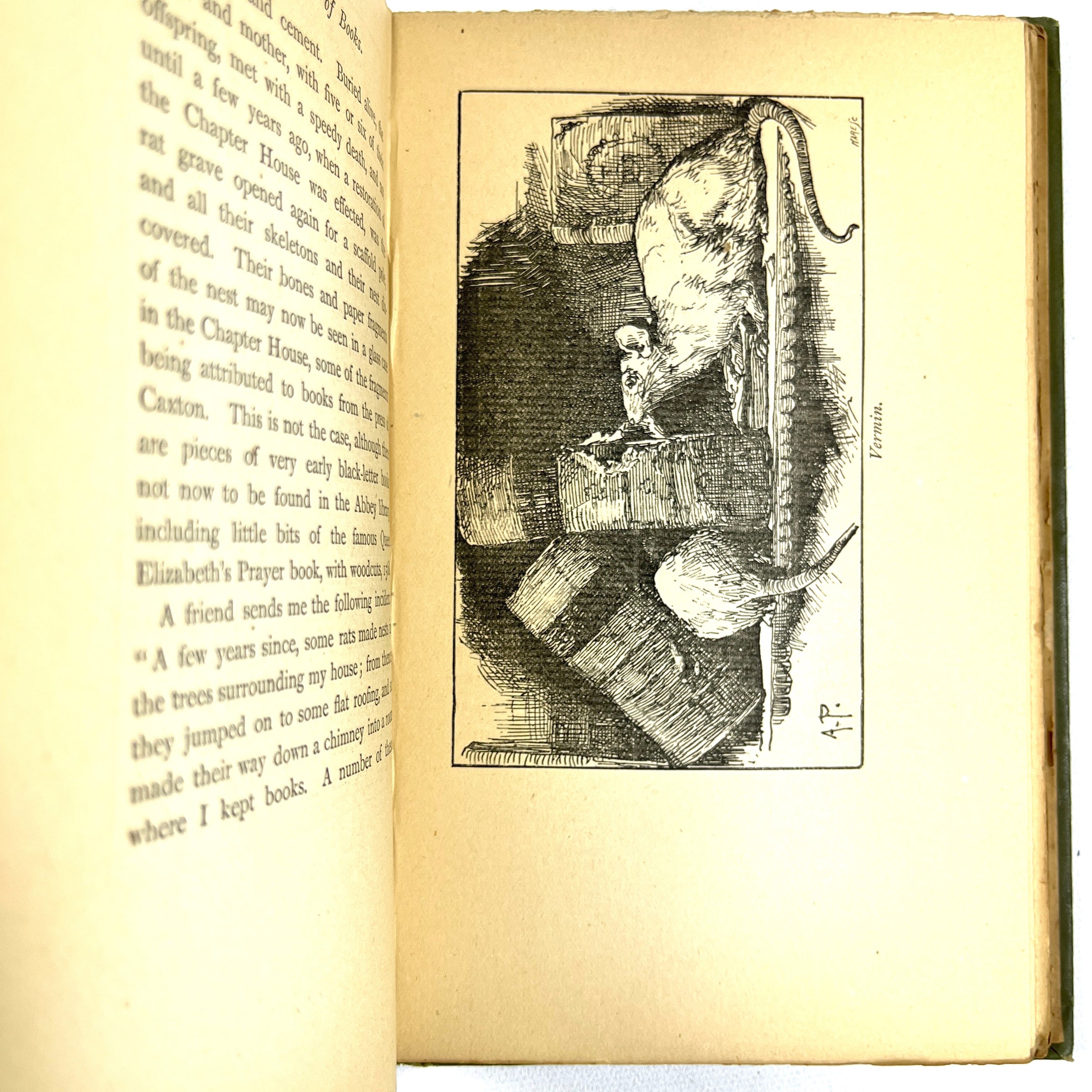 Very Good green cloth over beveled boards, gilt title lettering and owl design to front panel. Black-and-white unattributed illustrated frontispiece + 7 engravings. Floral pattern endpapers. Tiny remnant of dealer plate to front pastedown, splitting to upper rear hinge, binding still tight. Clean bright interior pages. Published as part of the Book-Lover’s Library series, revised enlarged edition. An examination of various misfortunes that can befall books including water, gas, dust, worms, rats, children, servants, and pirates. Overall, a handsome copy of a worthy title for any bookbinder or printer’s library.