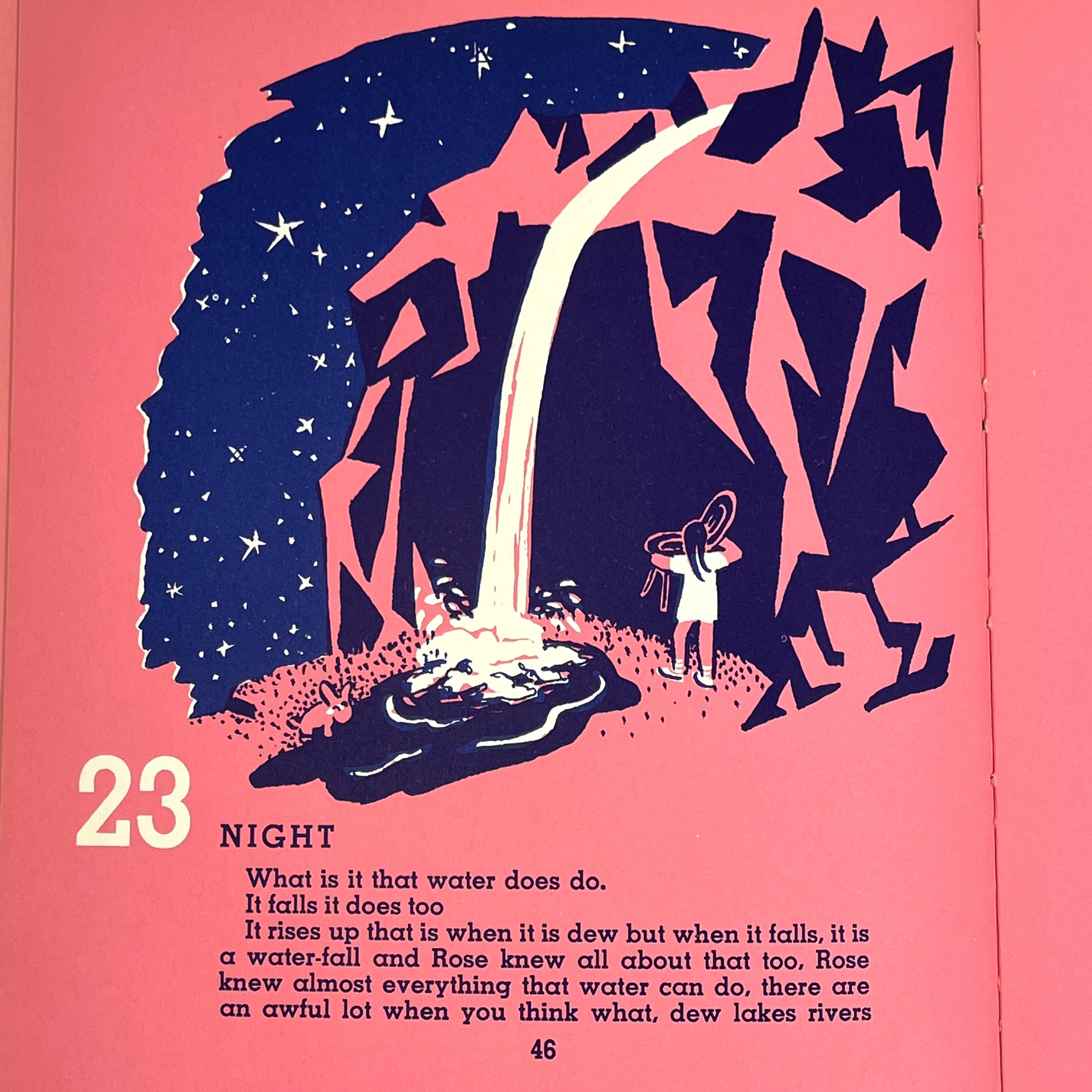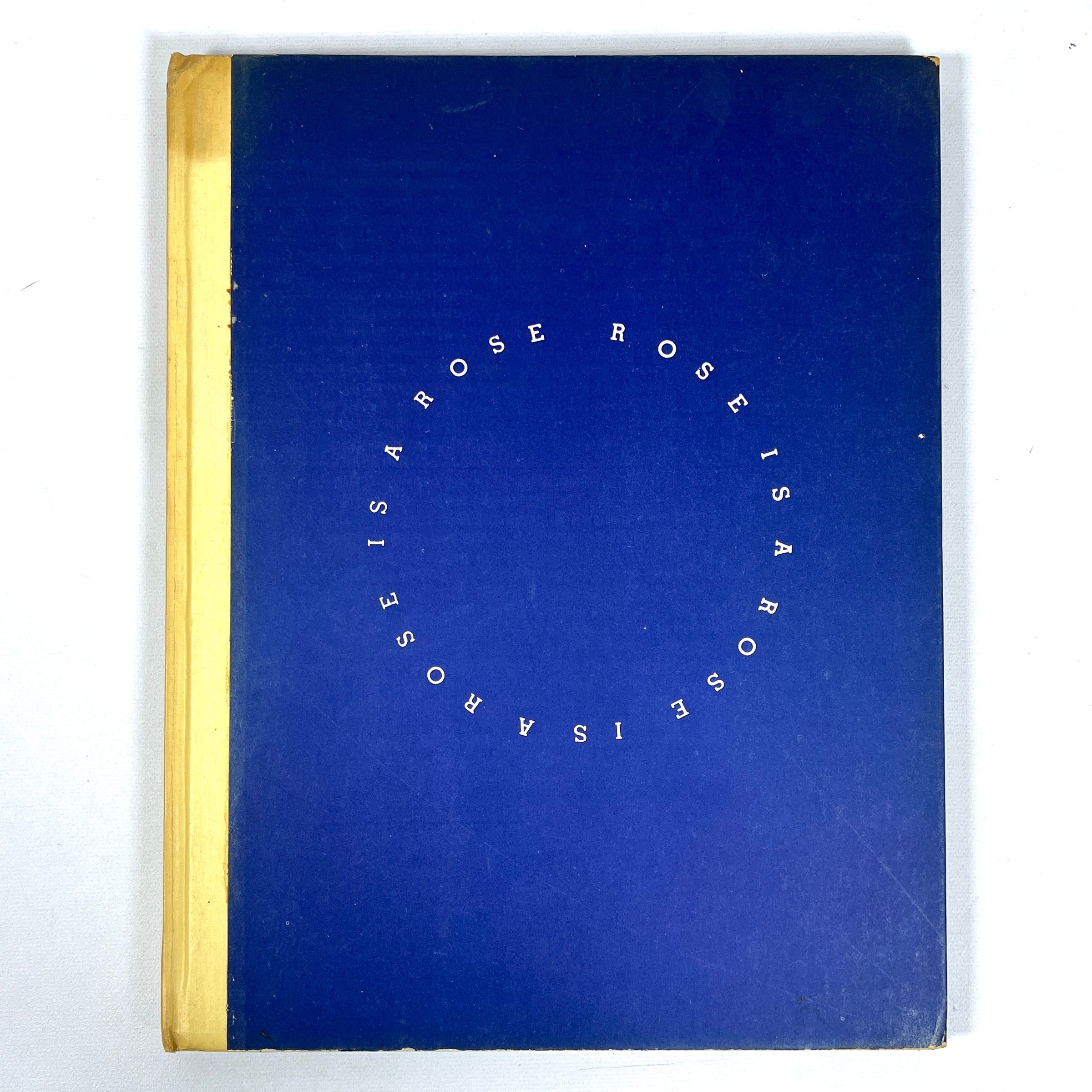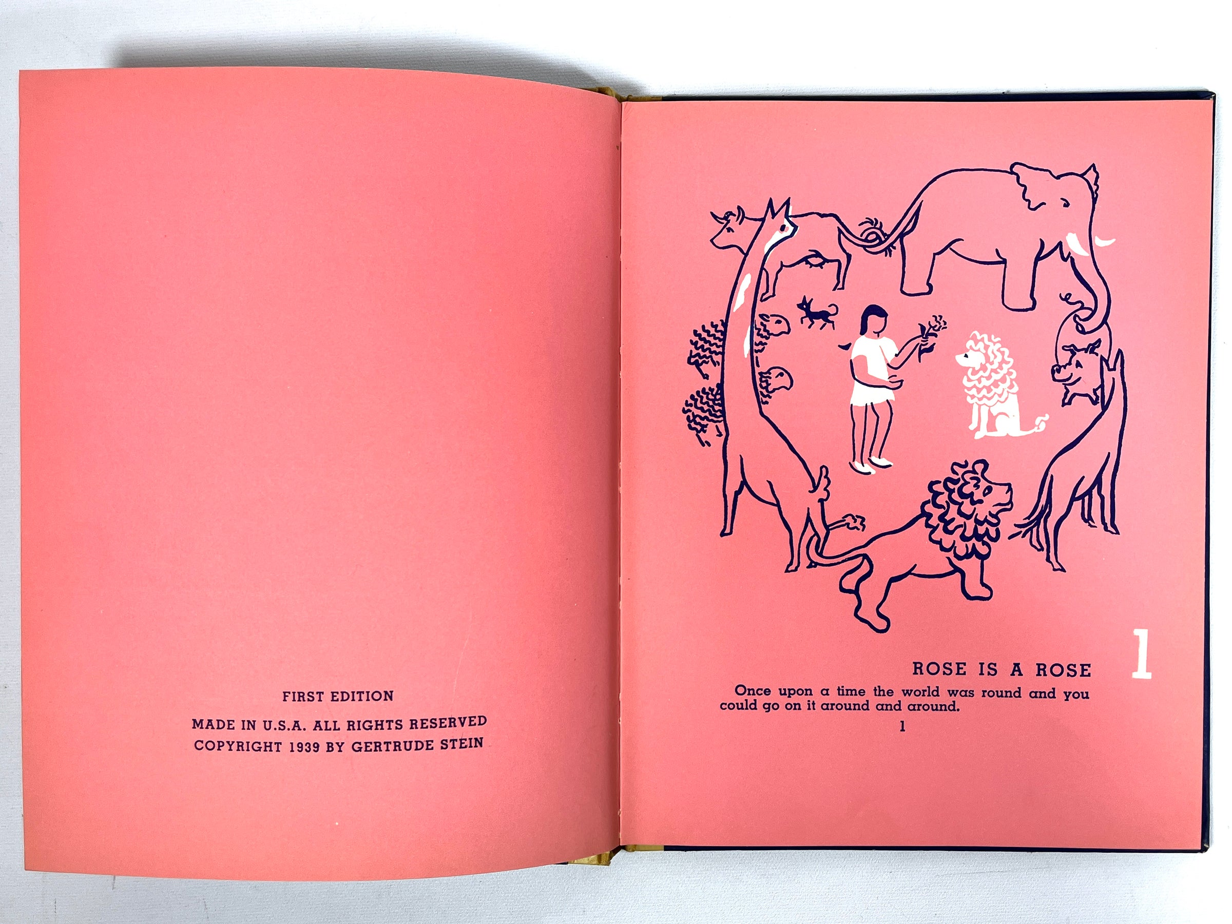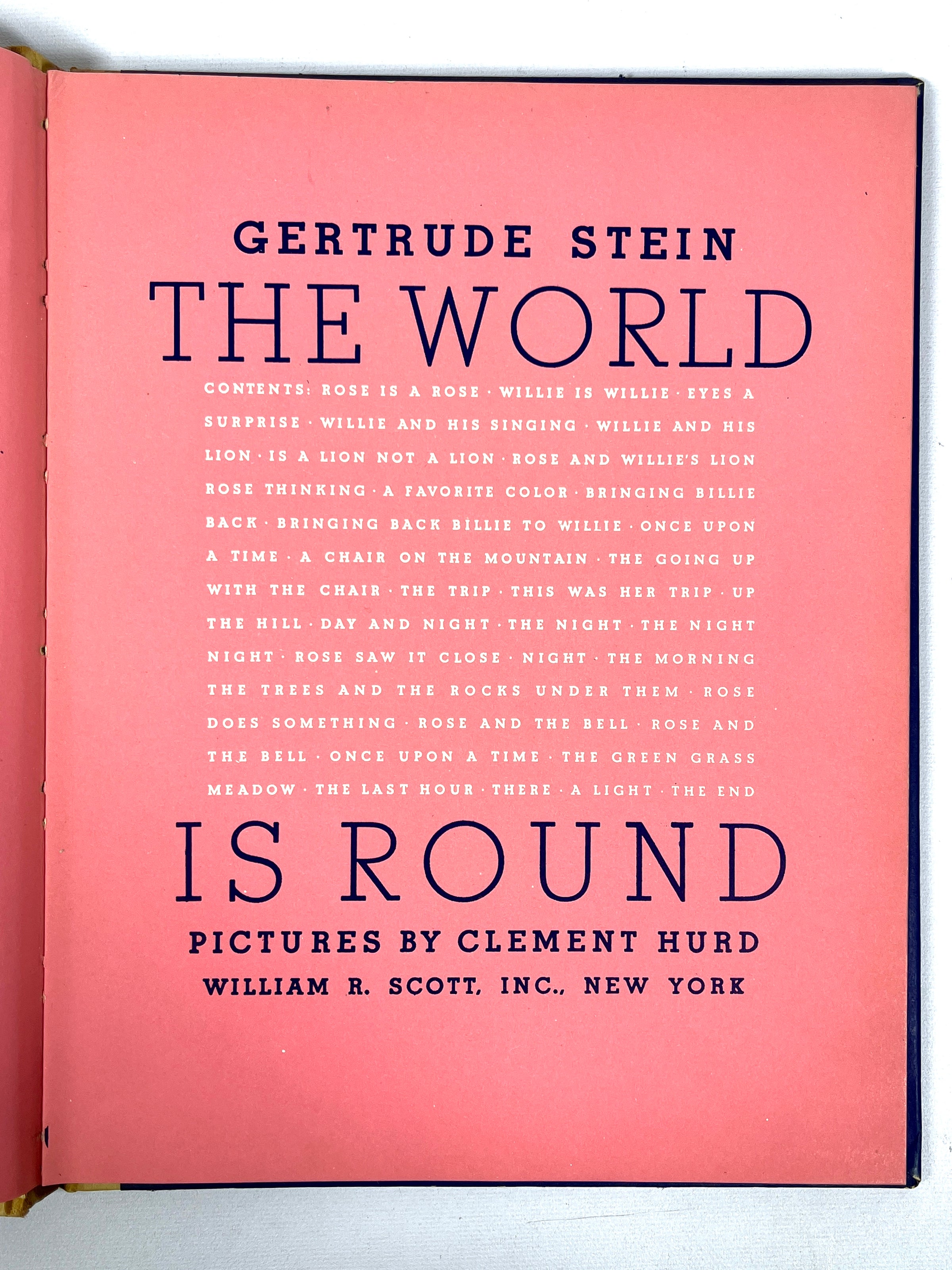 First Edition, hardcover in blue paper over yellow backing. Some wear to tips and bottom & top edges, sunning to spine, water stain and bump to head, minor soiling to exterior and interior, name written in pen to front pastedown, otherwise attractive and tightly bound. 67 pp. Includes blue and white illustrations by American children's picture book artist, Clement Hurd, who was known for his work in the classics, Runaway Bunny and Goodnight Moon. This charming children's poetry book, written by 20th-century novelist, poet, art collector, and playwright Gertrude Stein, follows a narrative around a girl named Rose. Printed on pink pages.