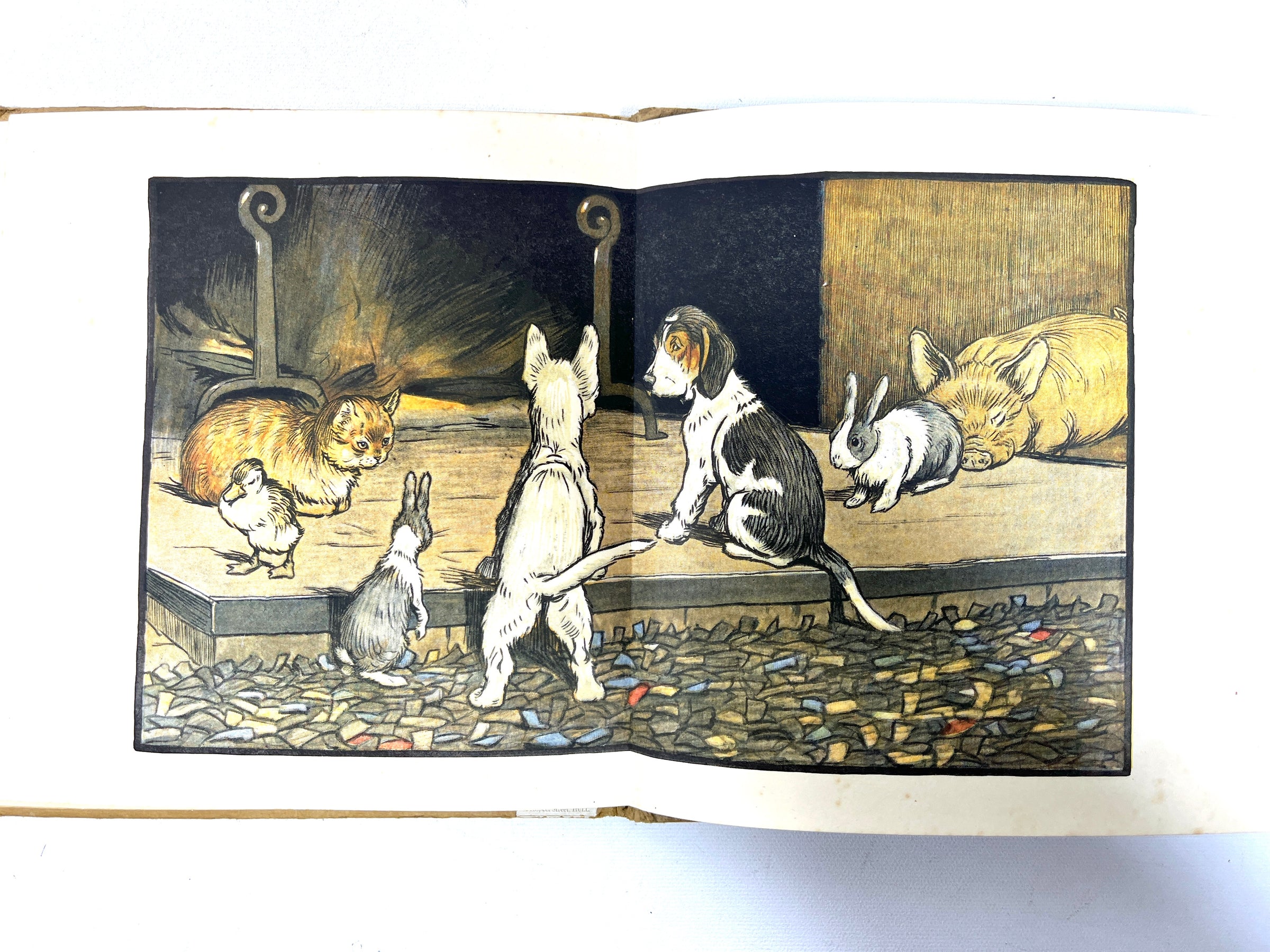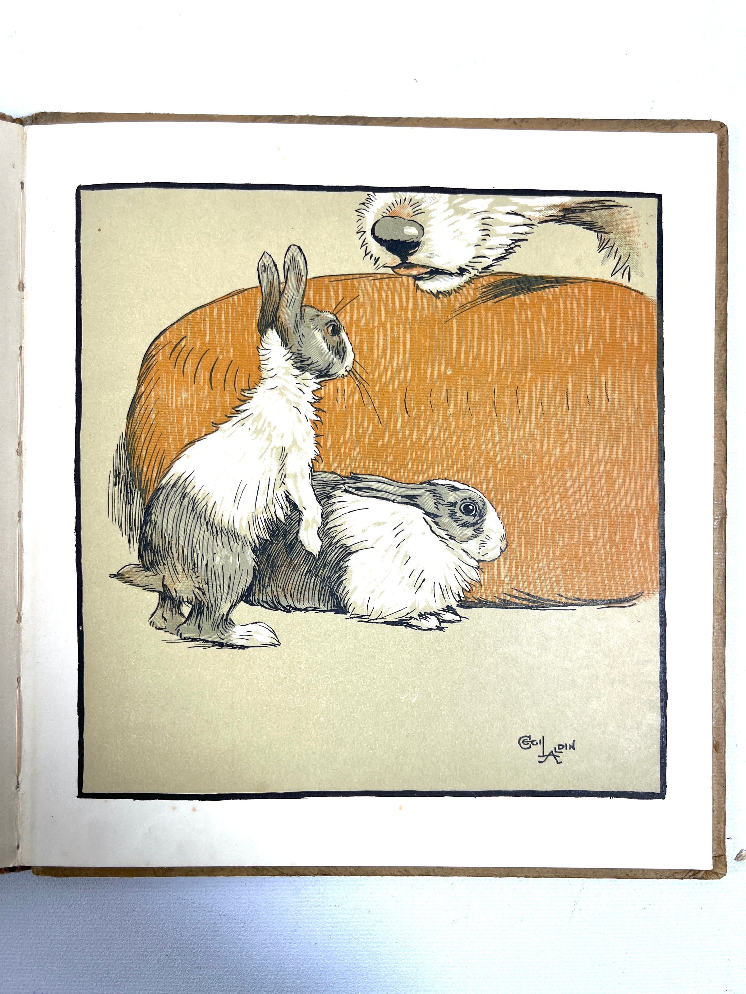 Very Good octavo hardcovers in beige paper with color illustrations affixed to front panel of every volume, black lettering to front panel and spine. Notable foxing and sunning, some wear to edges and tips with some small tears, minor interior soiling, pencil marks to back panel of No. II, yellow marks to the illustration of No.VI, and writing in crayon on the front panel illustration to No. IV. Most volumes have slightly cocked spines, with a starting spine to No. IV. Dealer plate or blind stamp to front pastedown or endpaper of each volume. Unpaginated. Includes full-color illustrations and black ink drawings by Aldin. Wonderfully produced edition of the complete six-part Happy Family series by British writer May Byron with illustrations by British artist Cecil Aldin, which features the stories of Hungry Peter, Rufus, Humpty and Dumpty, Rags, Master Quack, and Forager. Charming, well-loved children's book set with character.