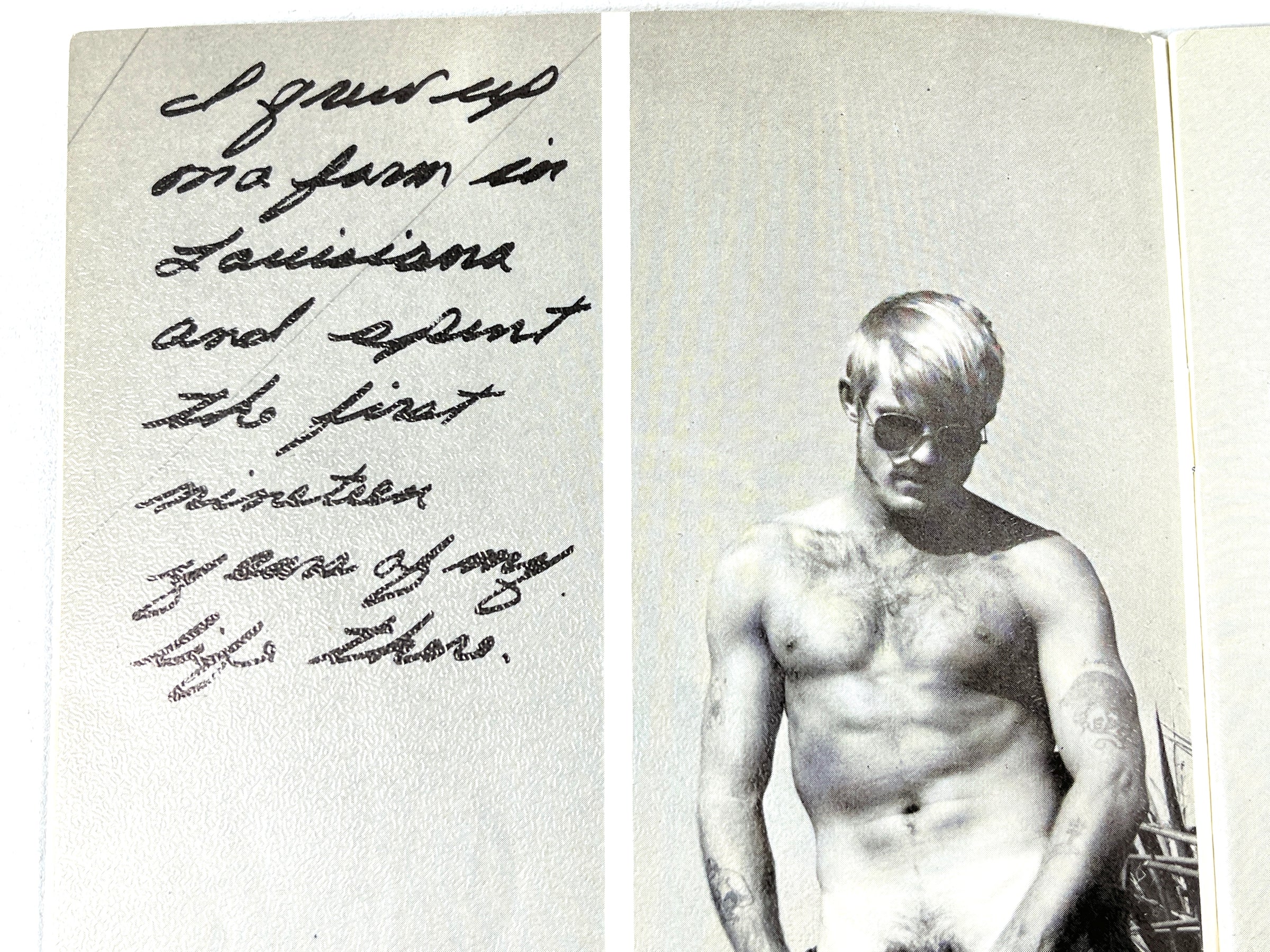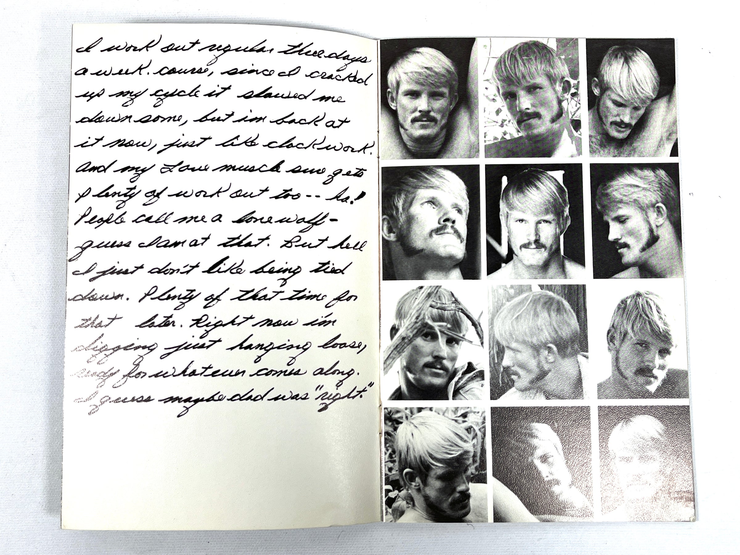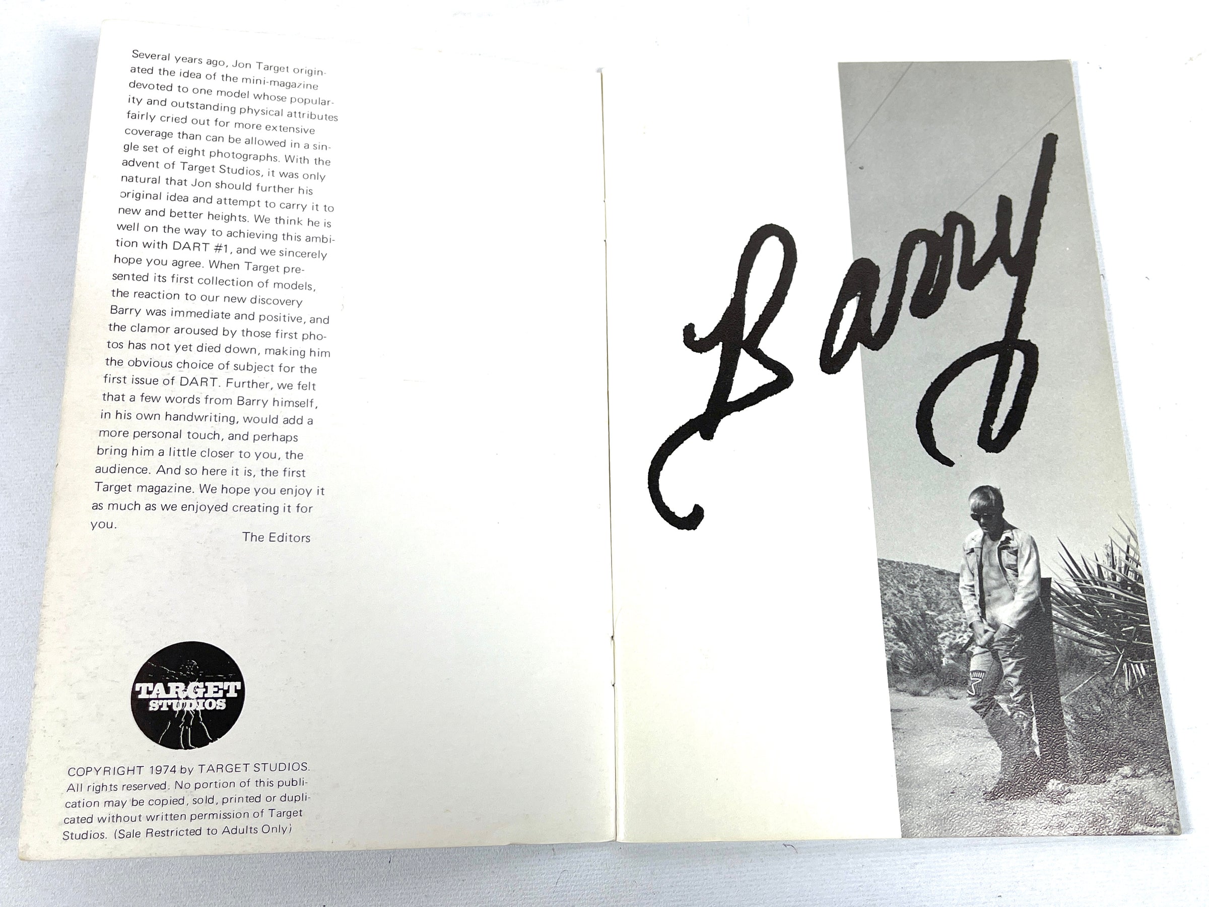 Digest sized softcover staplebound magazine in black-and-white pictorial wraps, minor wear & creasing to spine, library stamp to front cover. First volume of this gay ‘mini-mag’ completely devoted to one model. In this issue Barry poses nude in outdoor scenes (mostly alone, but sometimes joined by a friend) and shows off his boots and impressive sideburns. Primarily black-and-white photos w/ eight pages in full color, accompanied by charming diary-like notes in Barry’s own handwriting.