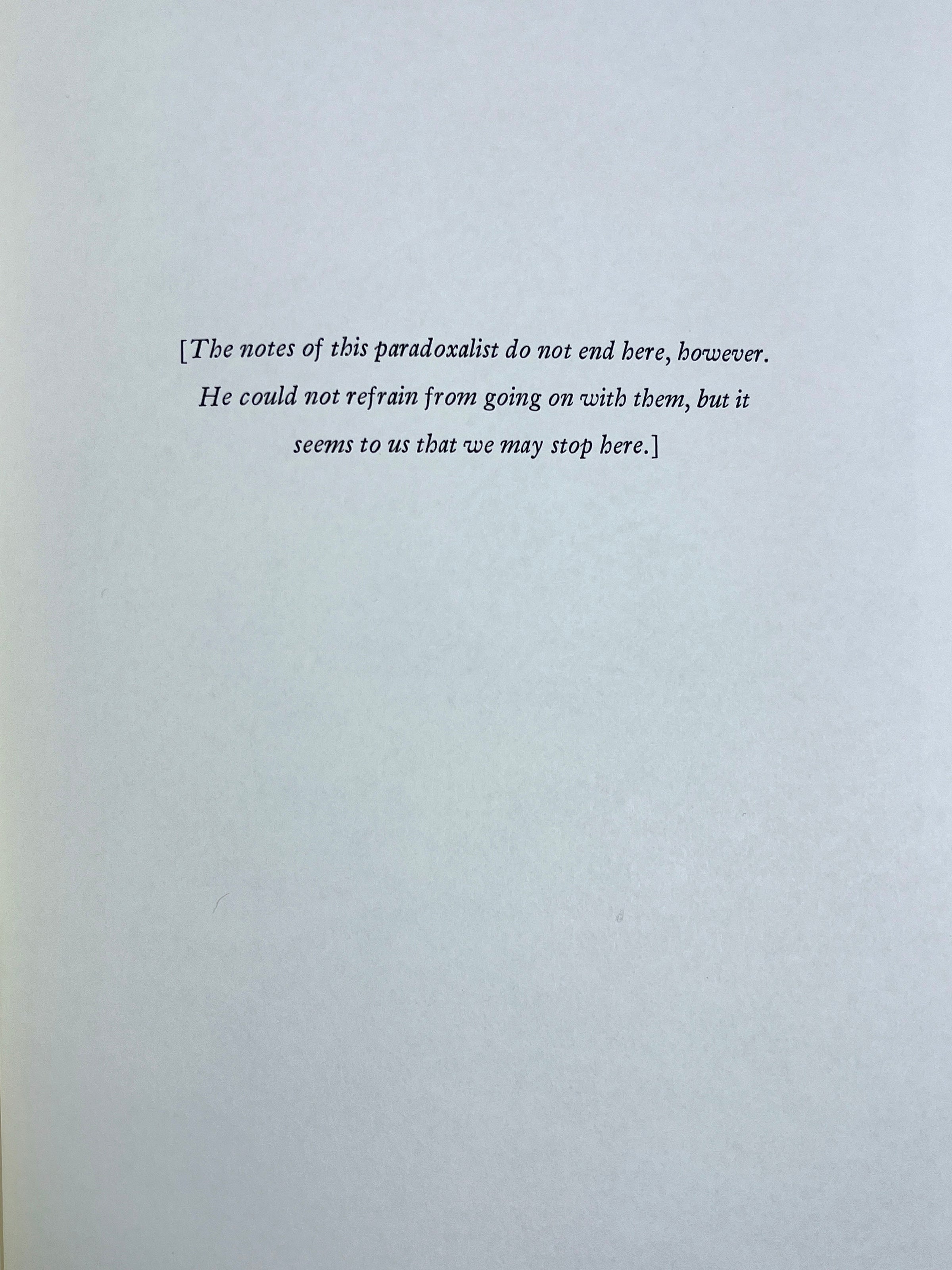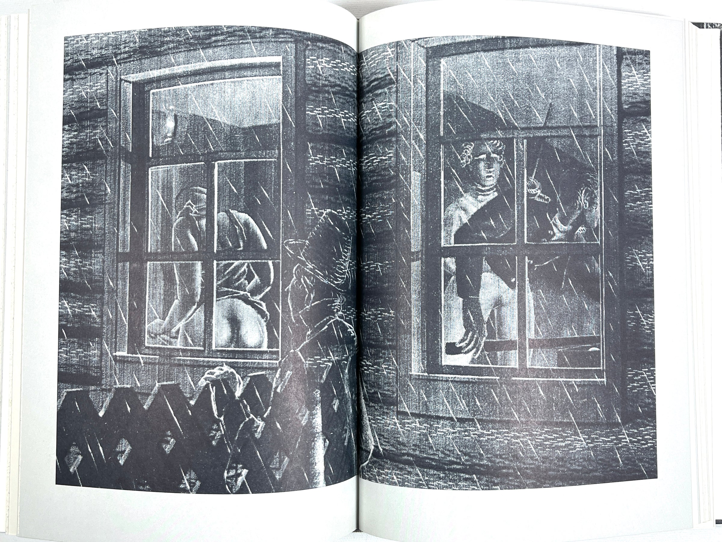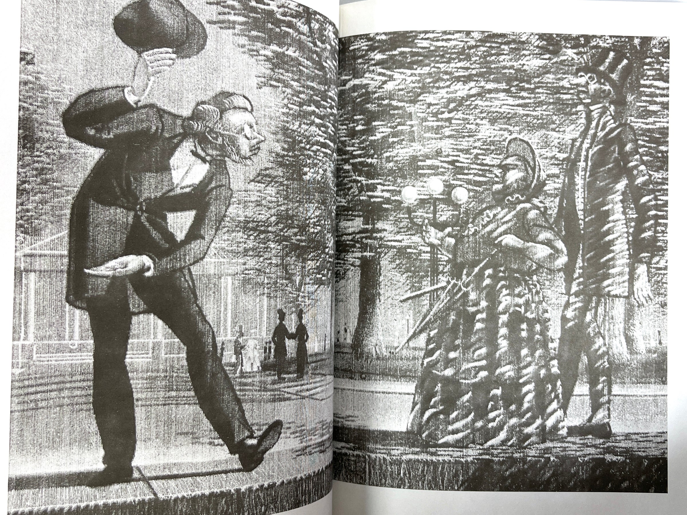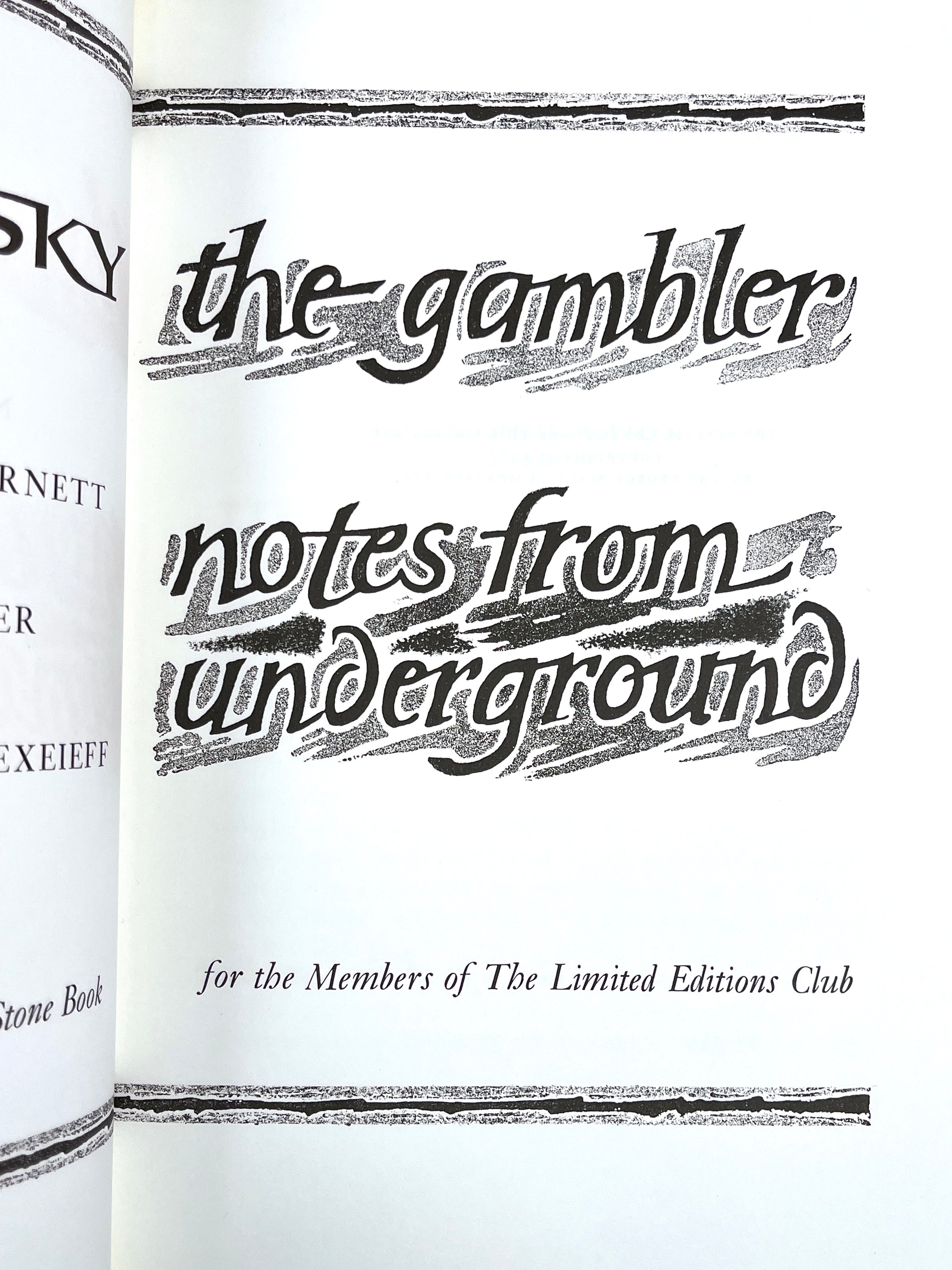 Beautifully designed edition of the combined short novel The Gambler (1866), and the novella Notes from Underground (1864) by the widely influential Russian existential novelist, Fyodor Dostoevsky, which displays his literary range from depictions of love and obsession, to nihilistic and ideological discourse. Accompanied by eighty-one pages of monochrome, pinscreen illustrations, with both single-page and double spreads, by Russian-born artist, Alexandre Alexeieff, in collaboration with American engineer and animator, Claire Parker. Decorative lettering and titles are etchings by Peter Johnson. Includes an Introduction by American literary critic and essayist George Steiner. Translated by Constance Garnett. Signed by Alexeieff on the copyright page. The Monthly Newsletter, No. 399, is laid-in and present in Near Fine condition, and half-sheet in Very Good condition with a number in pen written to the back.