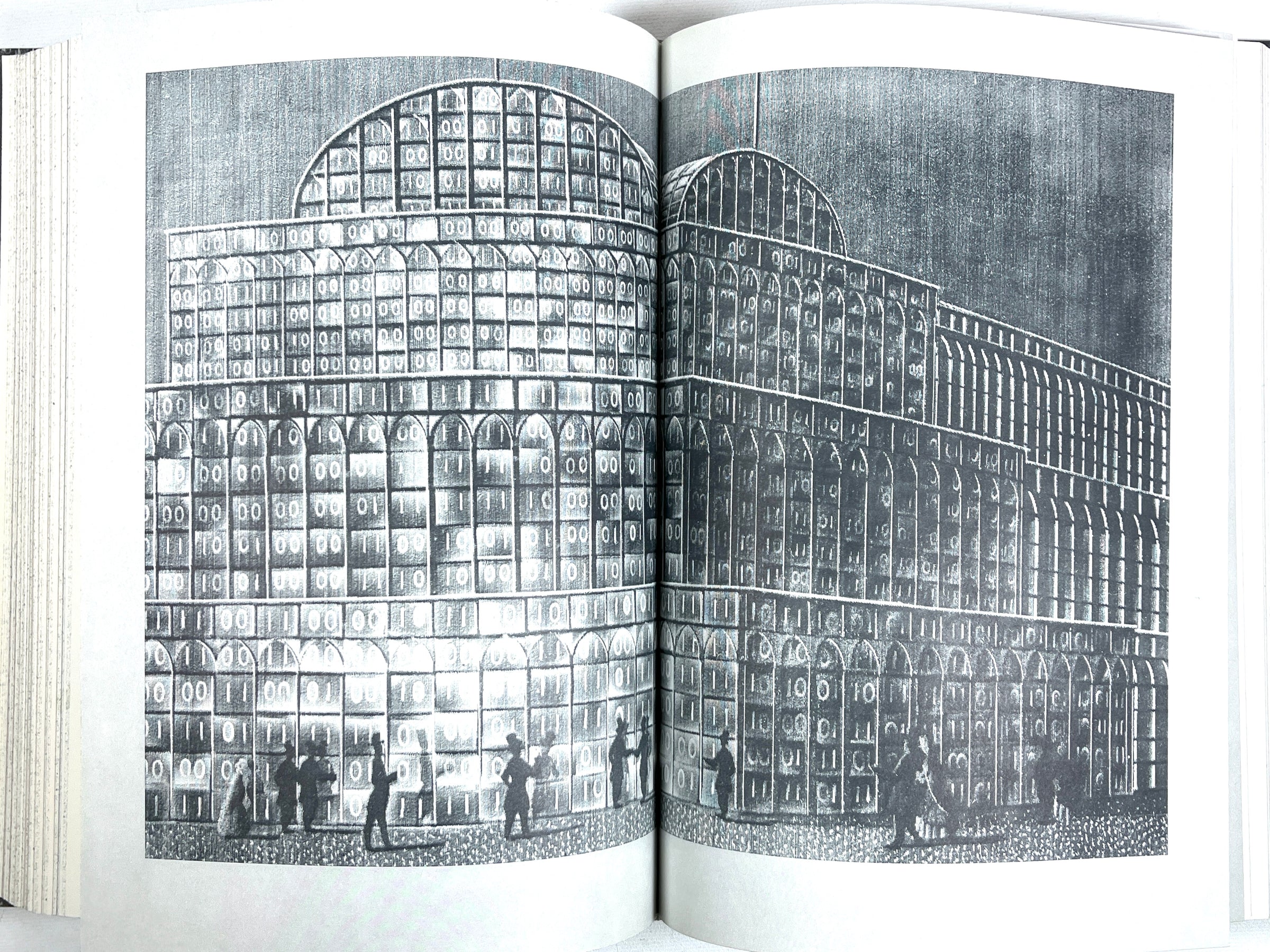 Near Fine octavo, 10 1/2" x 7 3/4". Hardcover with black-and-white pictorial vellum cloth with pinboard illustrations, over dark blue cowhide backing with stamped gilt lettering and borders, and blue speckled text block edges. Slight tinge of pink and blue throughout text block, possibly transferred from images. Very minor spots of soiling to fore edge and small pressure indentation to spine. Very Good red slipcase, gray title label to spine with black lettering and stippling, minor sunning, some shelf wear and light marks, possibly paint from shelves, to top and bottom edges.
