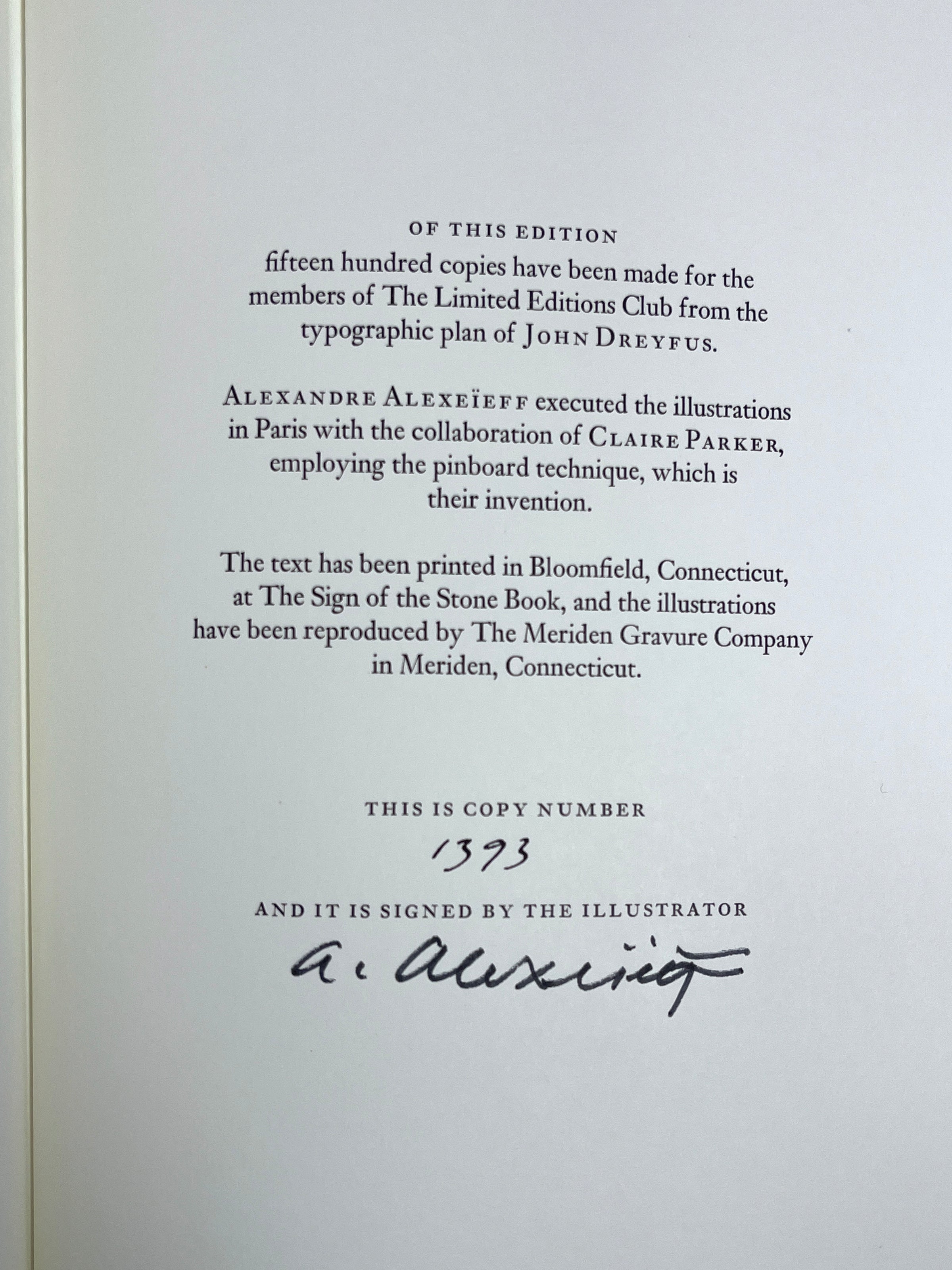 Dostoevsky, Fyodor, Bloomfield: The Sign of the Stone Book for the Limited Editions Club, 1967, #1393/1500, Near Fine octavo, 10 1/2" x 7 3/4", Illustrated and SIGNED by Alexandre Alexeieff.