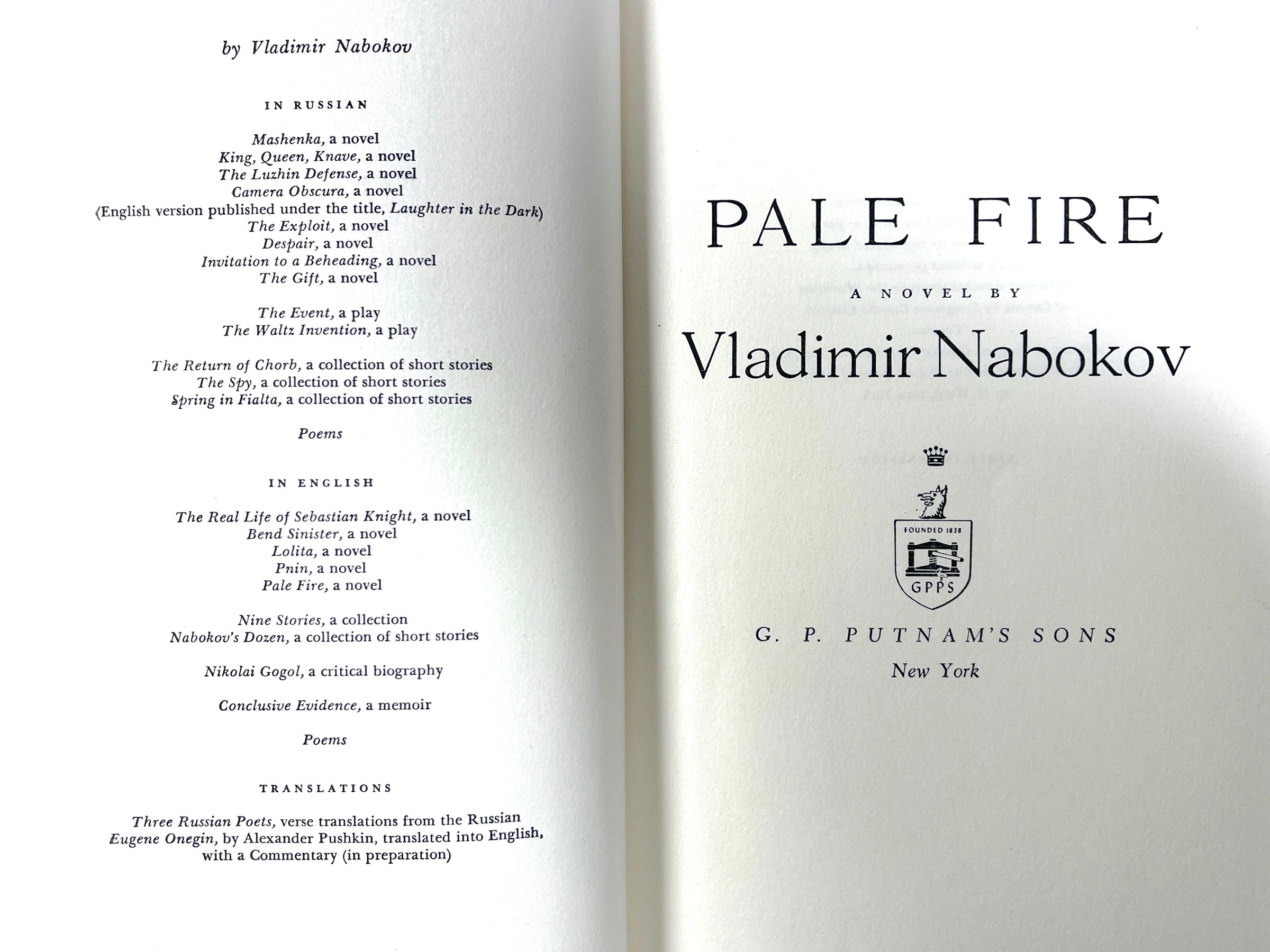 Nabokov, Vladimir, Pale Fire, New York: G. P. Putnam’s Sons 1962. English, Very Good hardcover 8vo, 5 ¾” x 8 ½”, 315 pp. Inc. index.