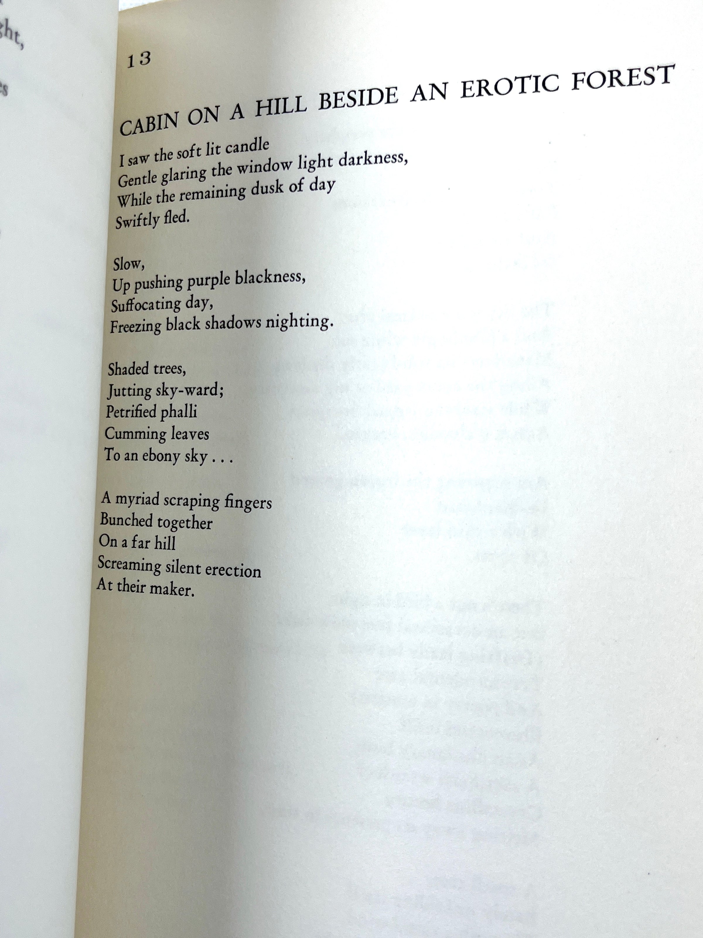 Softcover in pictorial wraps; signed in pen by author, William James Kovanda III to title page. Minor soiling, crease to front top corner, some foxing to top edge of text block, and stain to fore-edge. 52 pp. A self-published collection of work by American poet William James Kovanda III, laid out in four distinct sections: Nature Poetry, Hitch-Hike-Poetry, Of Women And Loves, and Cathartic Poetry.