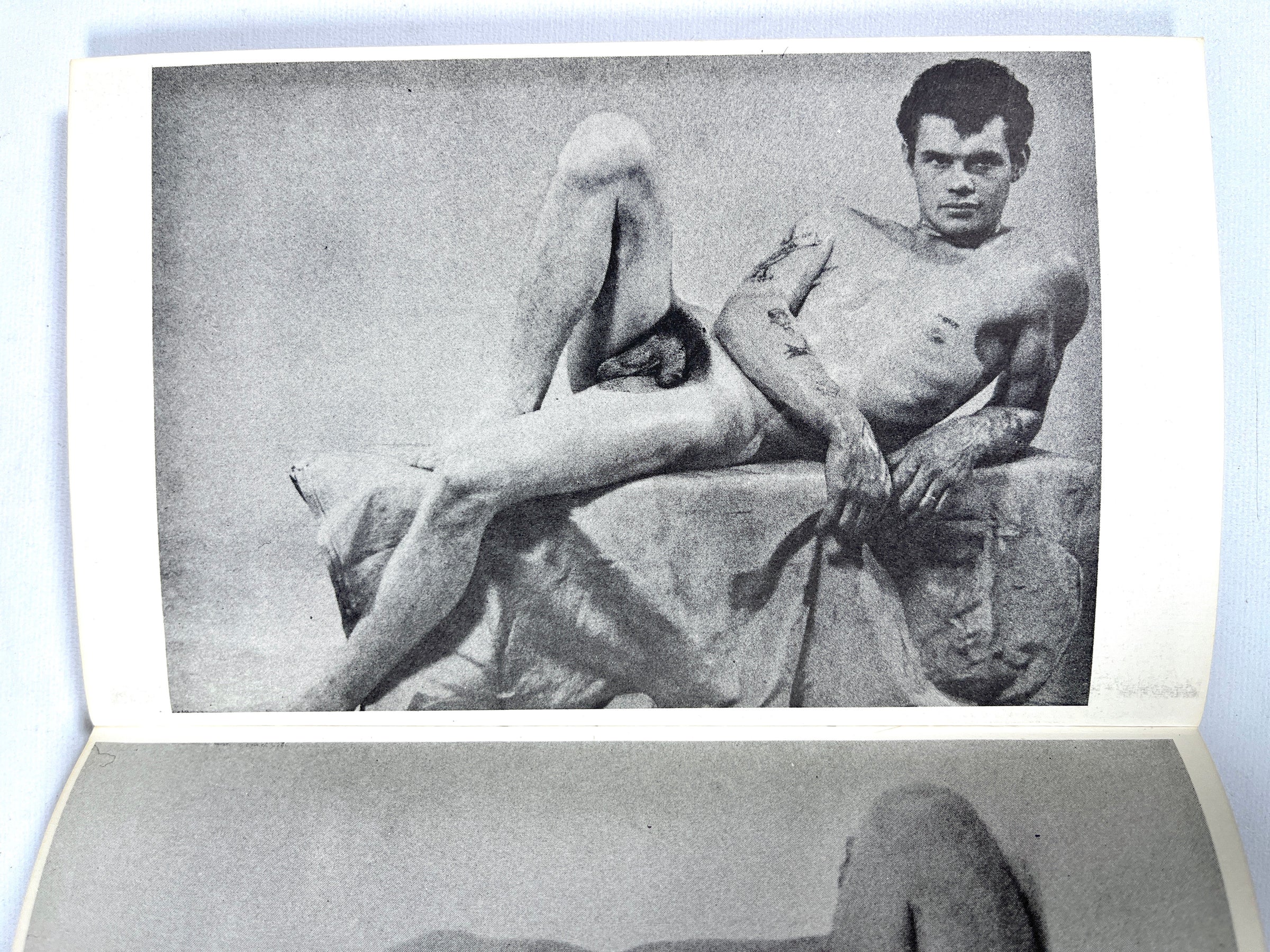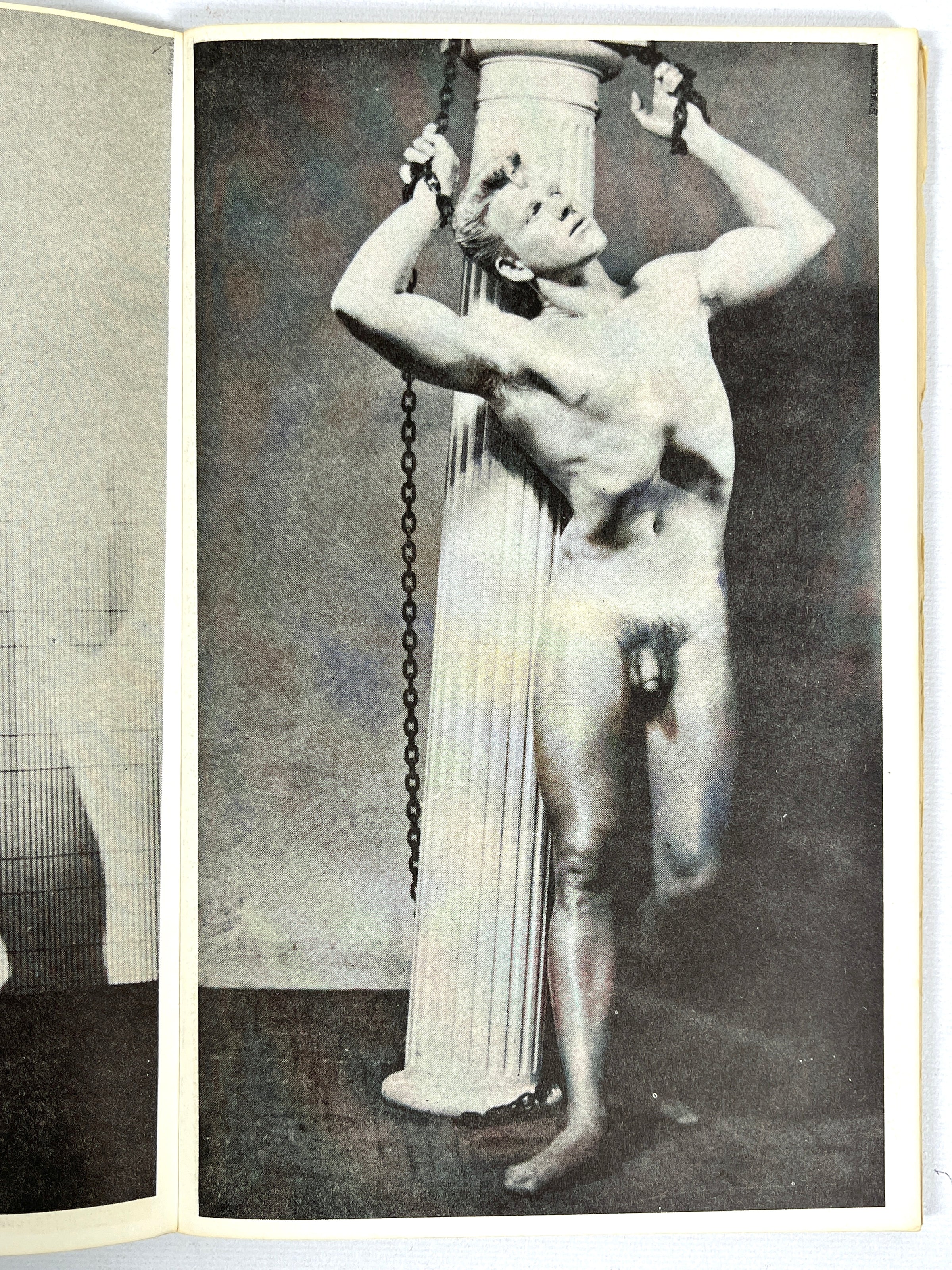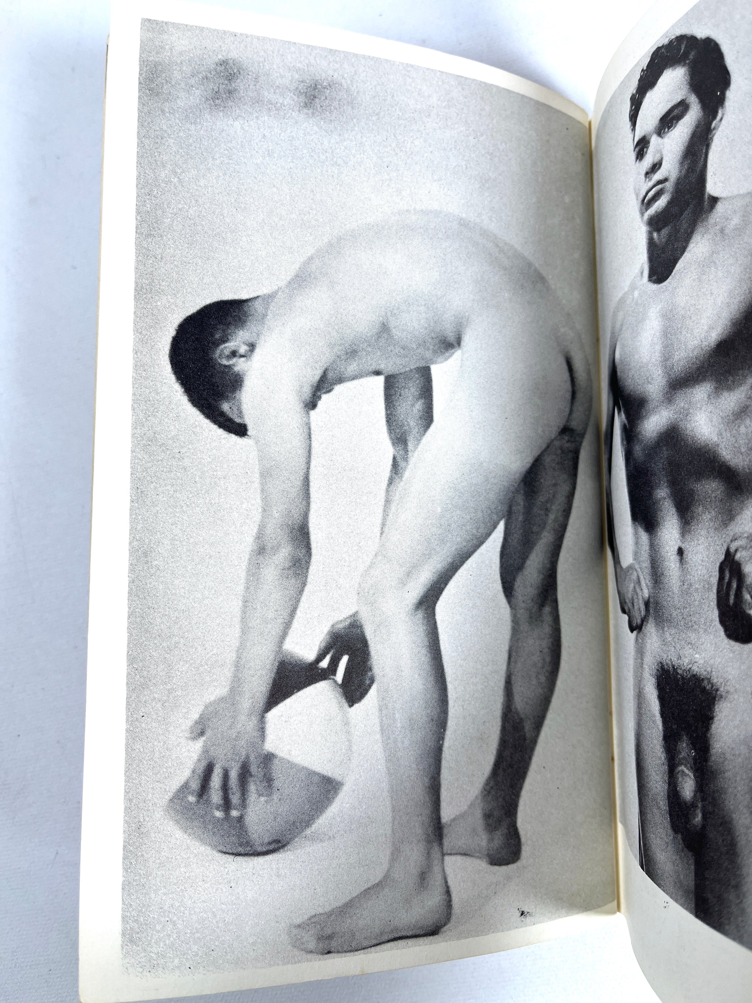 Staple bound in white wraps with a red illustration of a nude man. Notable foxing throughout, some wear to edges and tips, minor sunning, staple punctures to spine, small mark to head, and light soiling to wraps. Unpaginated. Includes full-page reproductions of black-and-white photographs of nude, muscled men in a variety of different poses. This fourth volume in the supplementary material series for drawing nude figures focuses on creating dramatic shadows with the visual guidance of bodybuilding nude men and an introductory note from Alfred Heinecke.